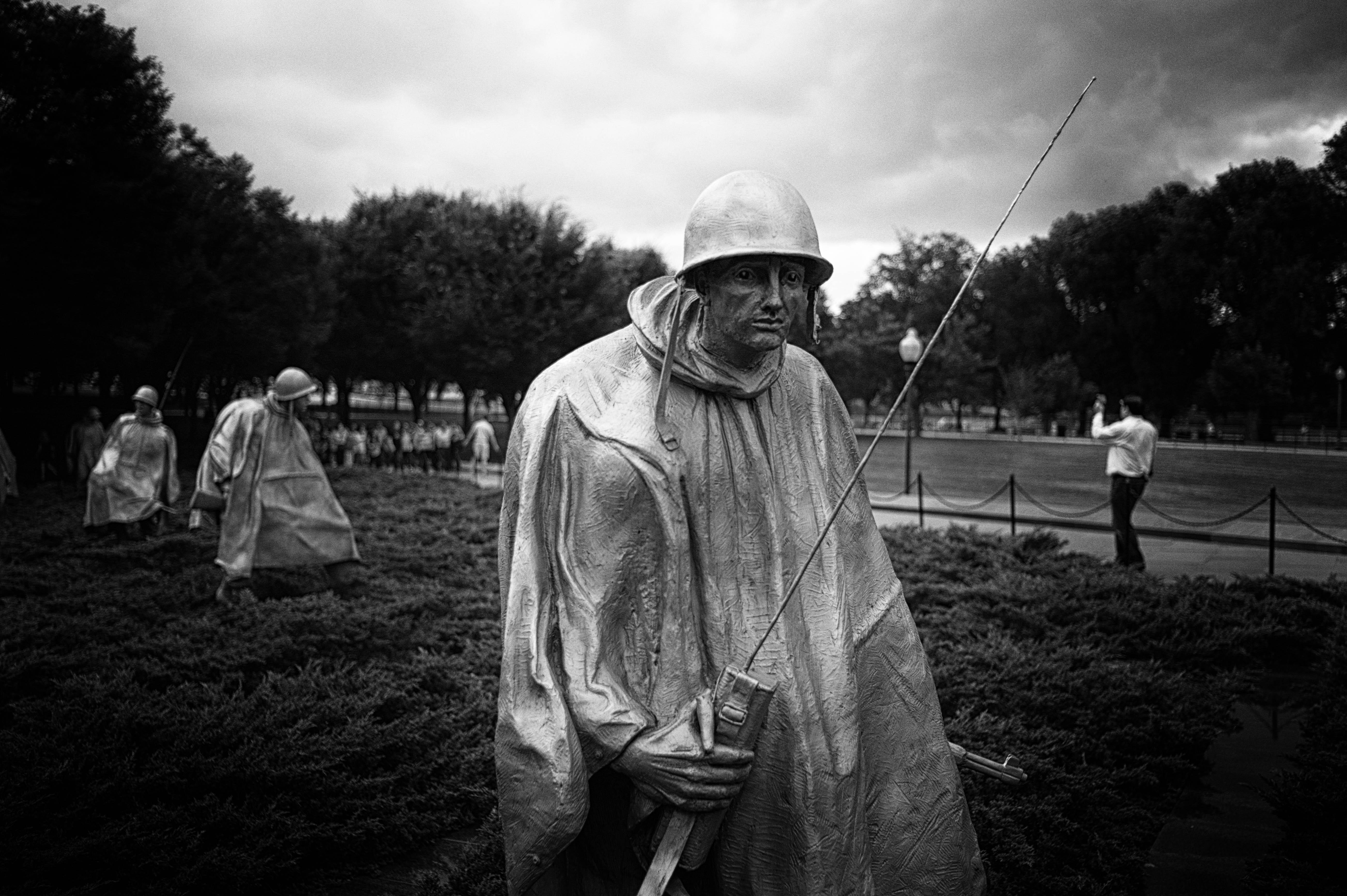 This striking black-and-white photograph captures a group of solemn military statues amidst a backdrop of dark, moody skies. The primary focus is on a lone soldier, his expression reflecting bravery and weariness, while the surrounding figures emerge subtly from the greenery, enhancing the sense of camaraderie. The dramatic lighting accentuates the textures of the sculptures, evoking a poignant atmosphere of remembrance and sacrifice.