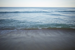 This tranquil photograph captures the gentle lapping of waves against a sandy shore, evoking a sense of calm and peace. The soft light of dawn casts a subtle glow over the water, enhancing its crystal-clear quality. The composition emphasizes the expansive ocean horizon, inviting the viewer to pause and reflect in this serene coastal setting.