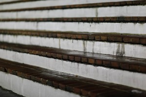 The photograph captures a close-up view of slick, whitewashed steps, their edges lined with earthy brick tiles. The interplay of light and shadow creates a moody atmosphere, evoking a sense of solitude and introspection. Water stains and textures tell a story of time, inviting the viewer to contemplate the journey upward.