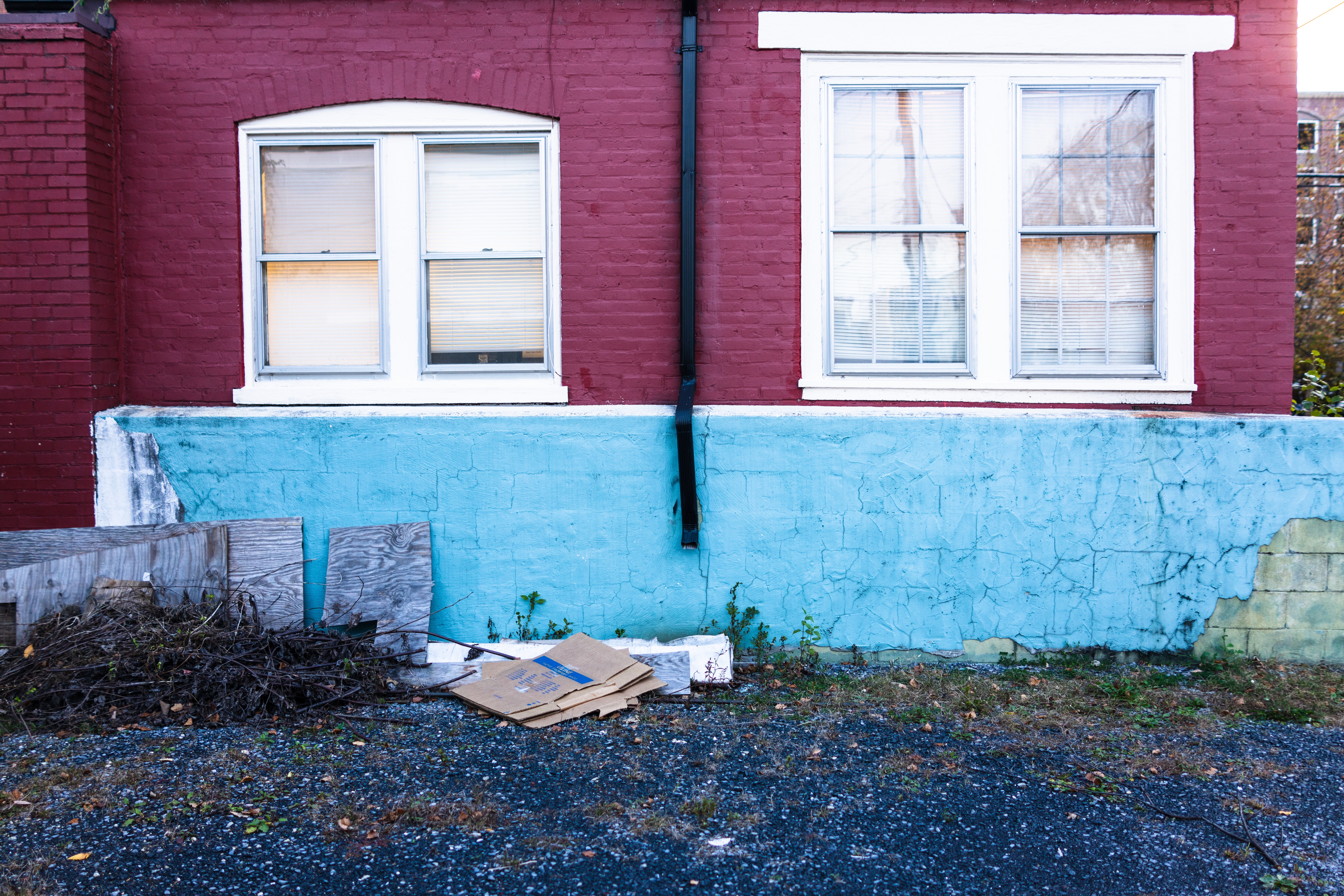 The photograph captures a striking juxtaposition of textures and colors, featuring a maroon wall with vintage windows beside a faded turquoise foundation. Discarded cardboard and debris hint at neglect, while natural light from the left casts soft shadows, enhancing the mood of quiet solitude. The composition is clean and symmetrical, drawing the viewer's eye across the contrasting elements.