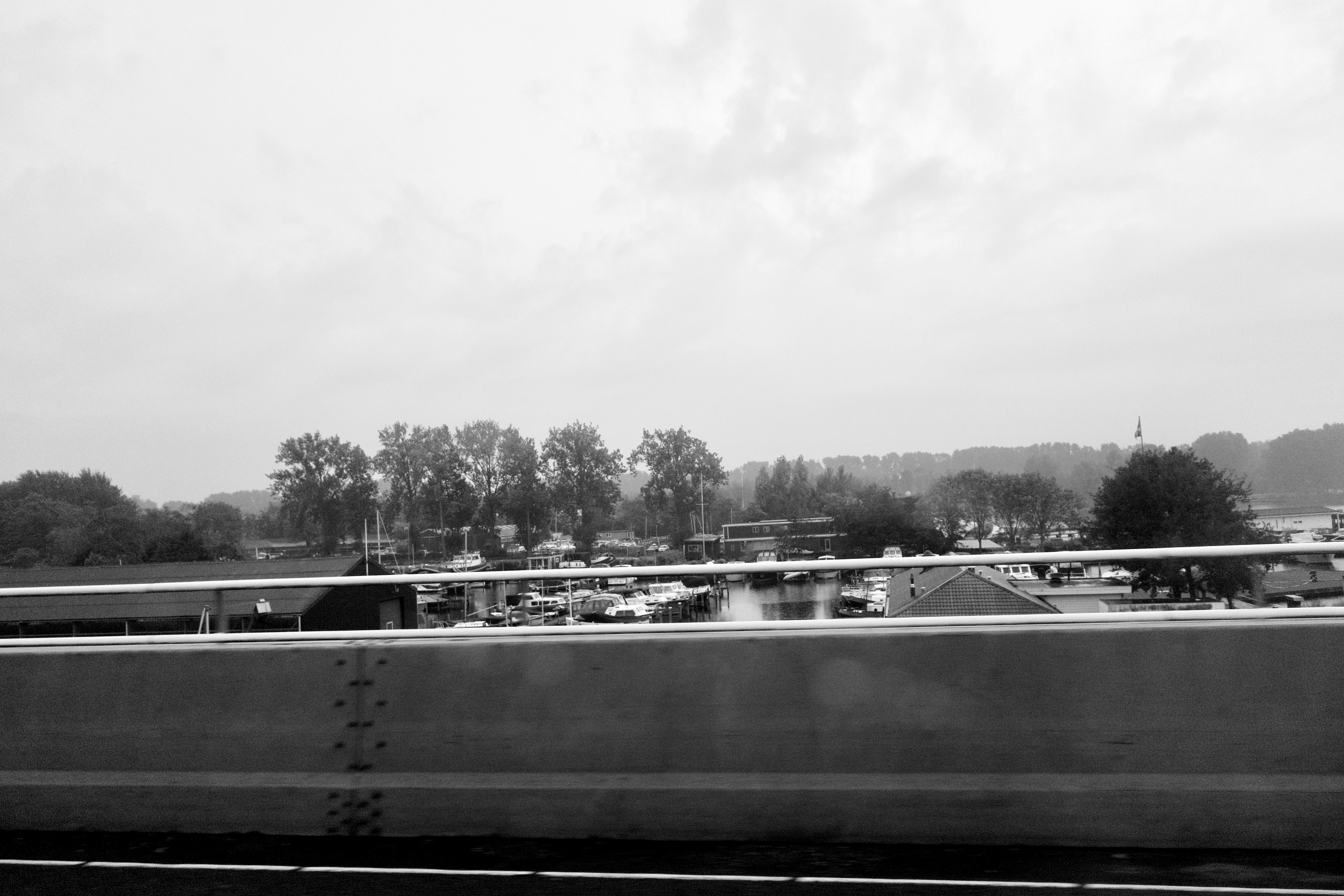 This photograph captures a somber landscape viewed through a vehicle window, characterized by a muted palette of greys. The composition presents a row of trees framing a marina, their reflections soft in the still water beneath an overcast sky. The overall mood evokes a sense of solitude and introspection, enhanced by the rain-soaked atmosphere.