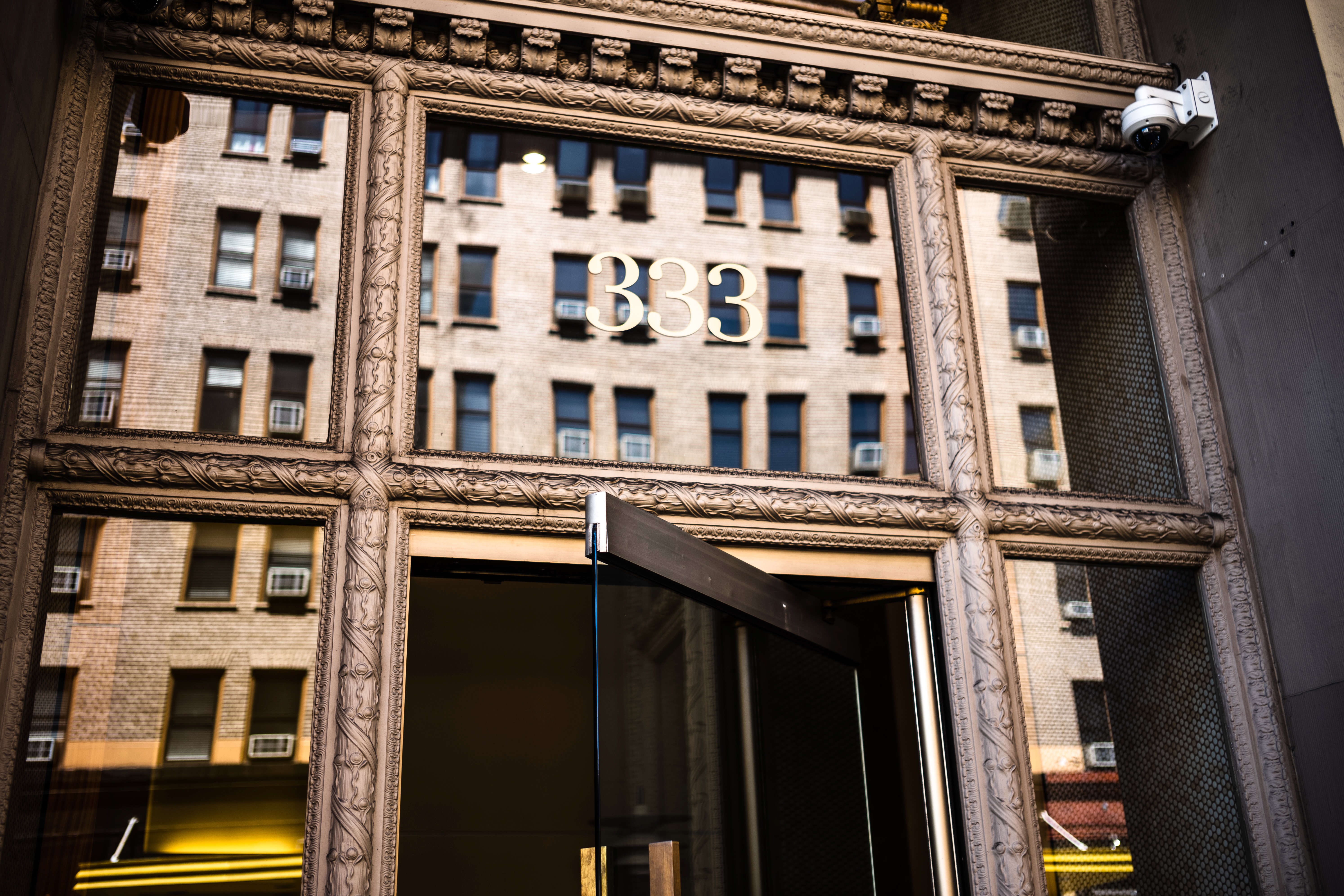 This photograph features the ornate entryway of a building, marked by the number '333' in elegant font. The interplay of reflections from the windows opposite creates a captivating visual connection between the architecture and the surrounding cityscape, evoking a sense of depth and urban charm. Soft lighting enhances the rich textures, highlighting the intricate details of the doorway against the backdrop of a bustling street.