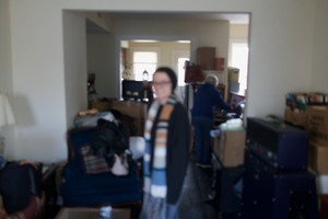 The photograph captures a moment of domestic chaos, with cluttered boxes and scattered belongings creating a sense of disarray. A figure in the foreground, partially obscured and blurred, evokes a feeling of uncertainty and transition, while the soft lighting enhances the mood of nostalgia. The contrast between the busy background and the focal figure hints at a narrative of change within a familiar space.