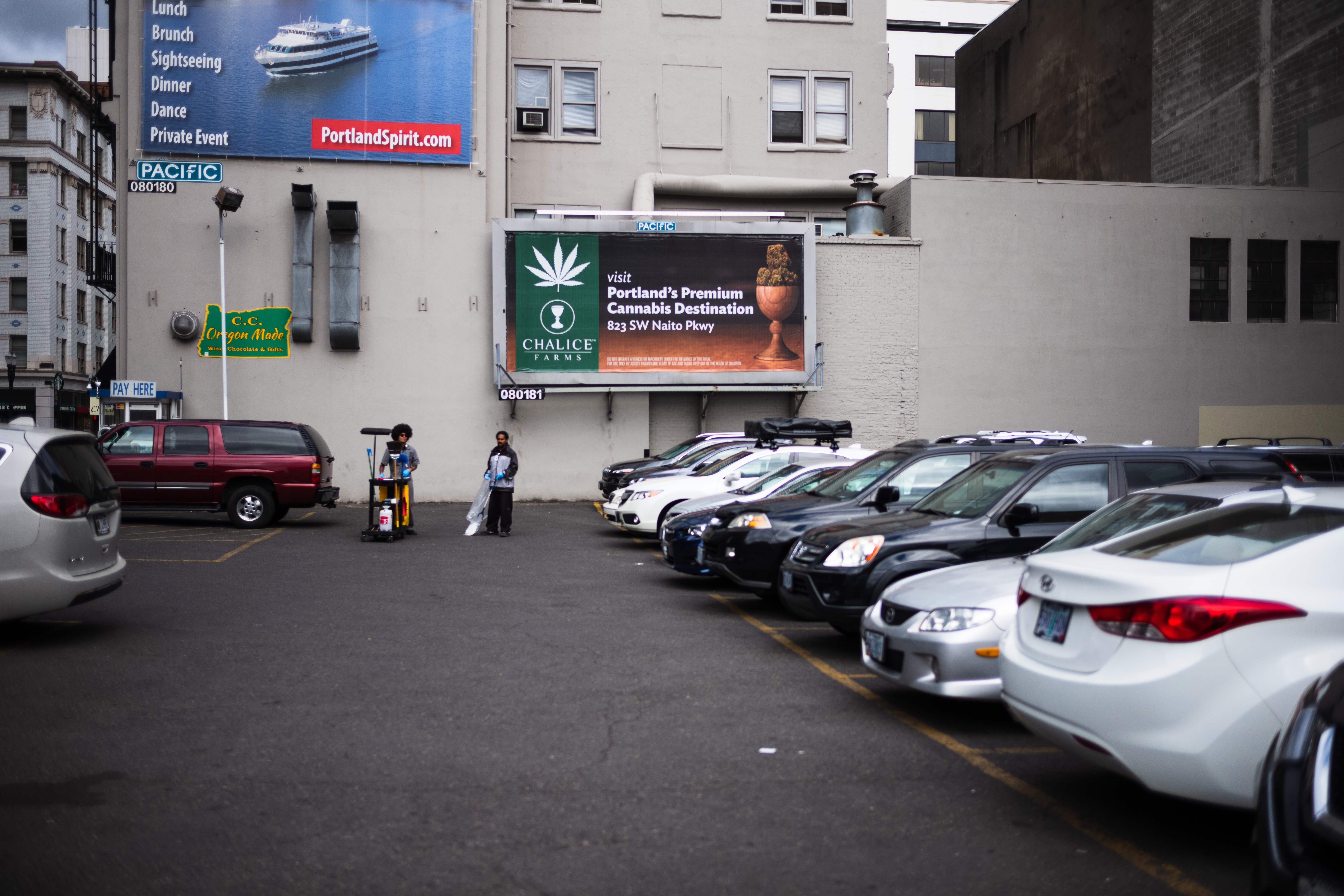 This photograph captures a moment in a bustling city parking lot, with a backdrop of advertisements adding a vibrant urban context. The mood is a blend of anticipation and quietude, as two figures stand near a line of parked cars, seemingly engrossed in their surroundings. The lighting is soft and diffused, lending a calm atmosphere to the lively urban setting.