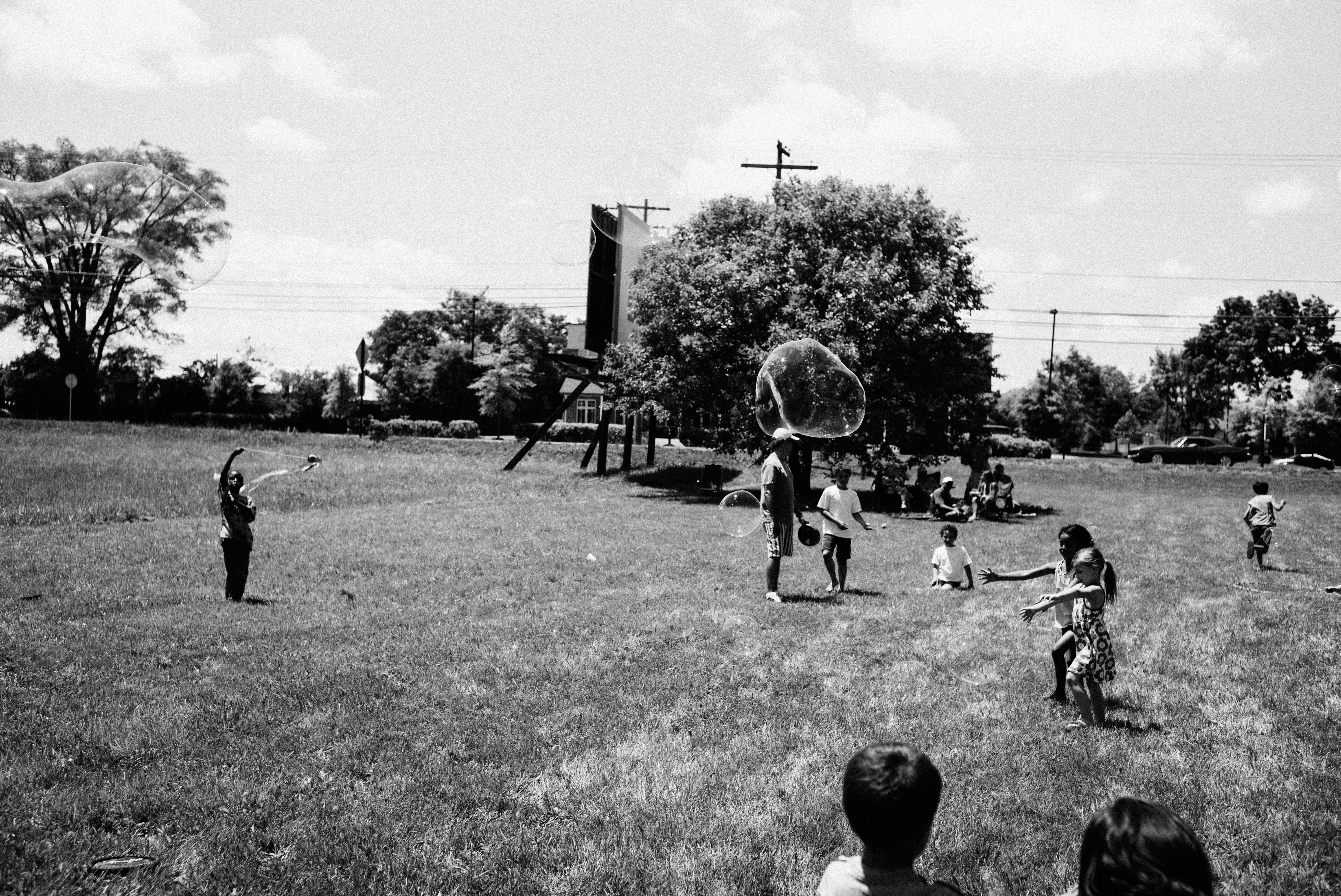 In this lively scene, children are caught in the carefree act of chasing and popping bubbles on a sunlit day. The monochrome palette adds a nostalgic charm, emphasizing their joyful expressions and the playful nature of childhood. With a lively composition showcasing movement and engagement, the photograph captures a perfect moment of innocence and joy.