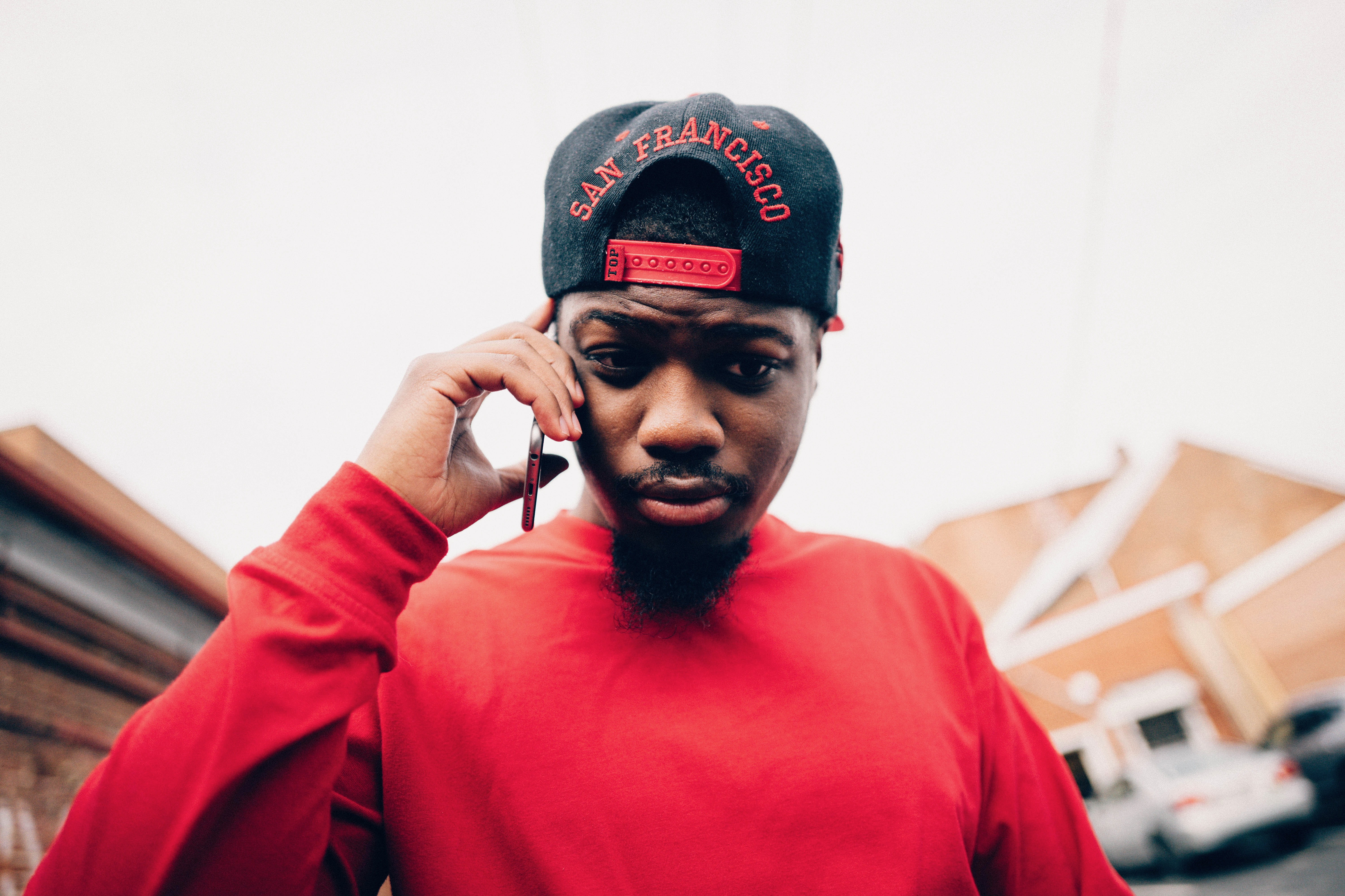 A young man in a bright red sweatshirt engages in a phone call, his expression contemplative and focused. The urban backdrop is softly blurred, drawing attention to his thoughtful demeanor and the vibrant colors of his attire. Natural light bathes the scene, giving it a candid yet striking feel that resonates with street style.