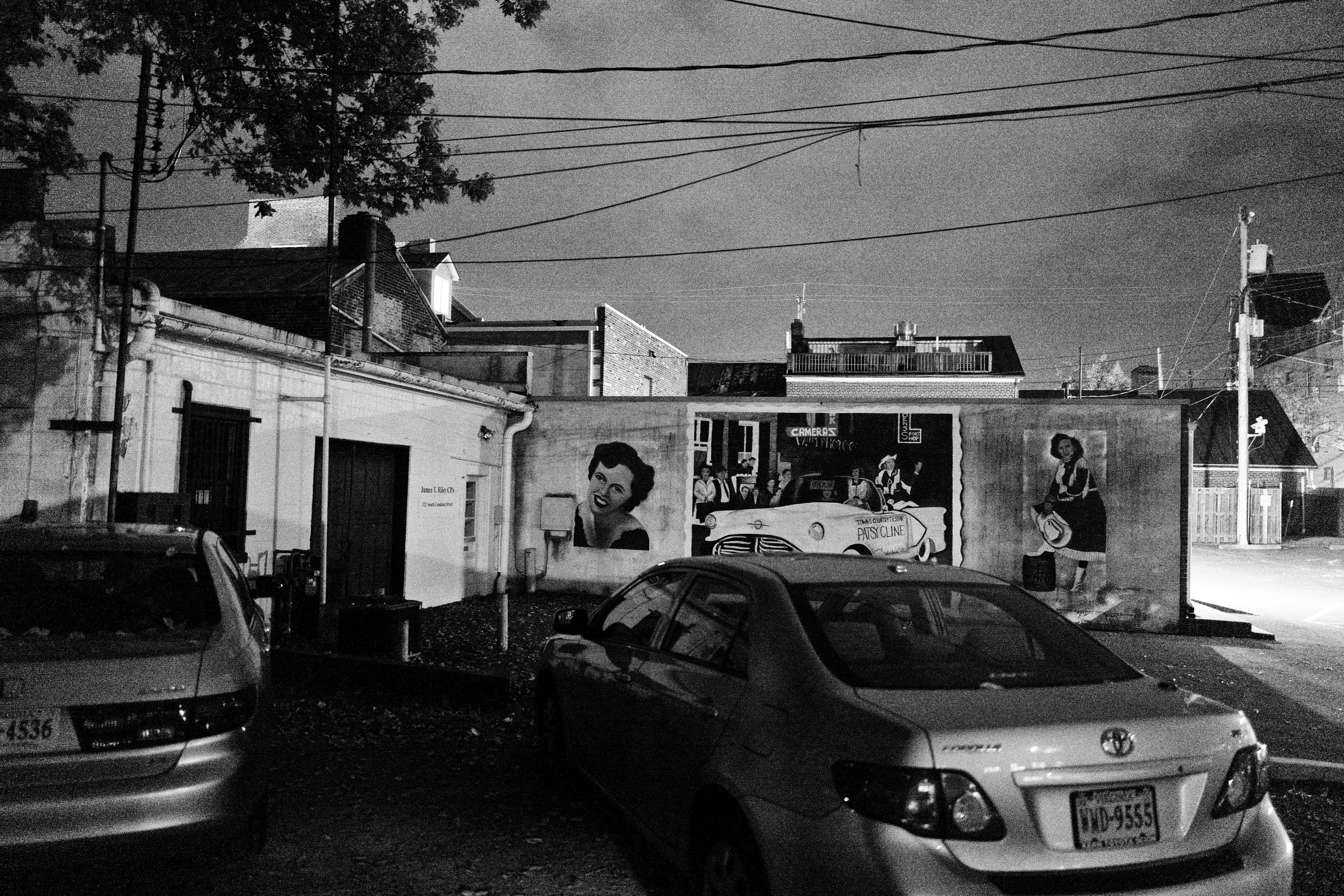 A quiet urban scene captured at night, featuring a mural on a weathered wall amid parked cars. The soft glow of distant streetlights and the stark contrast of shadows evoke a nostalgic, contemplative mood. Intersecting power lines stretch overhead, adding a layer of complexity to the composition, while the monochrome palette enhances the feeling of stillness and urban solitude.