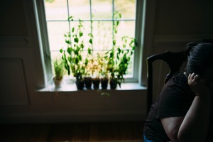 In a quiet, softly lit room, a woman sits with her head resting in her hand, embodying a moment of introspection. The lush greenery of potted plants in the window contrasts with her subdued demeanor, creating a poignant juxtaposition of life and solitude. The composition draws the eye to both the emotional weight of her posture and the vibrant yet untended nature beyond the glass.