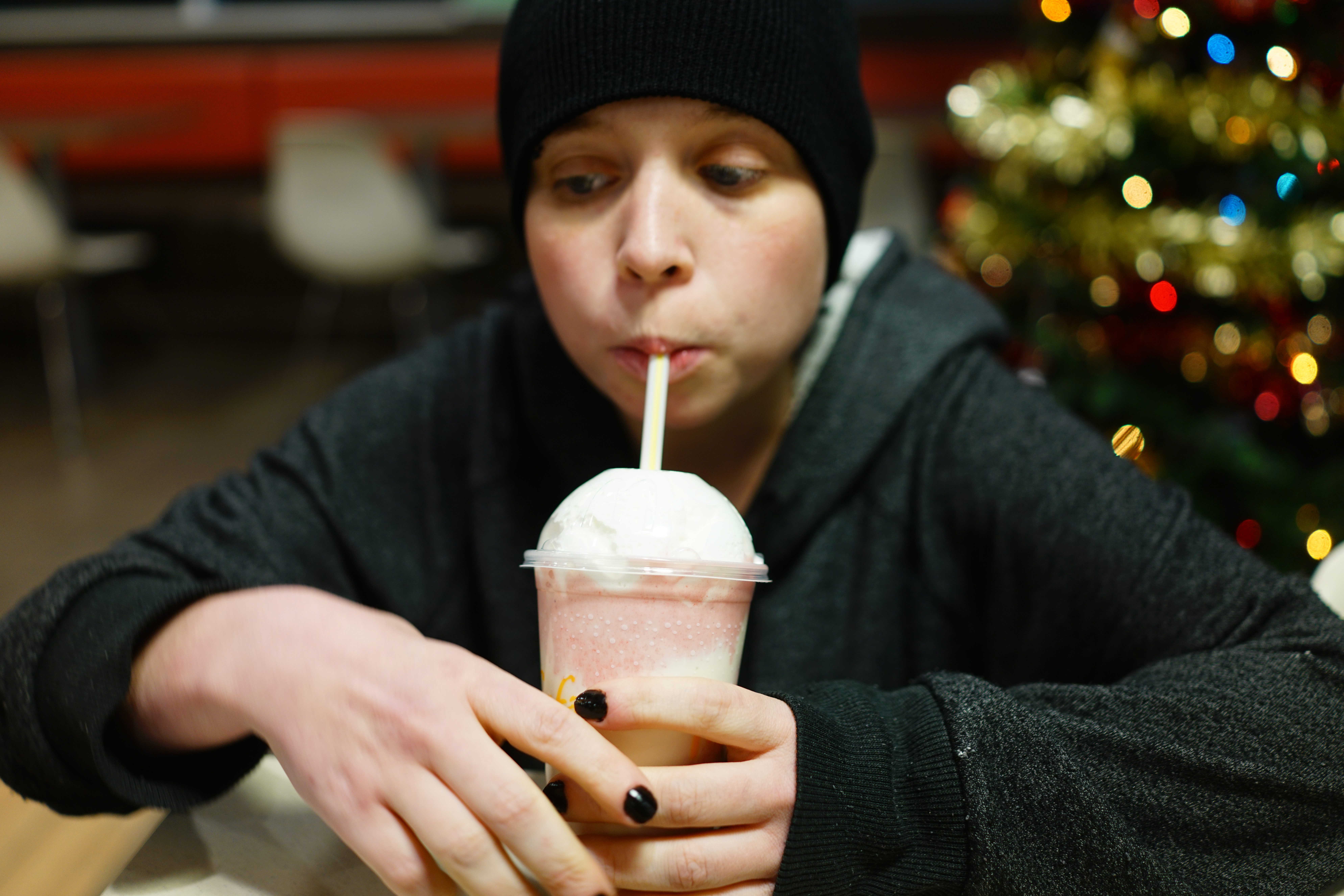 In a cozy fast-food setting, a young person in a beanie enjoys a creamy drink, their focus on the delightful treat. Warm, soft lighting contrasts with the festive background, creating an intimate, reflective mood. The composition highlights the juxtaposition of the individual’s casual attire and the cheerful atmosphere of the holiday season.