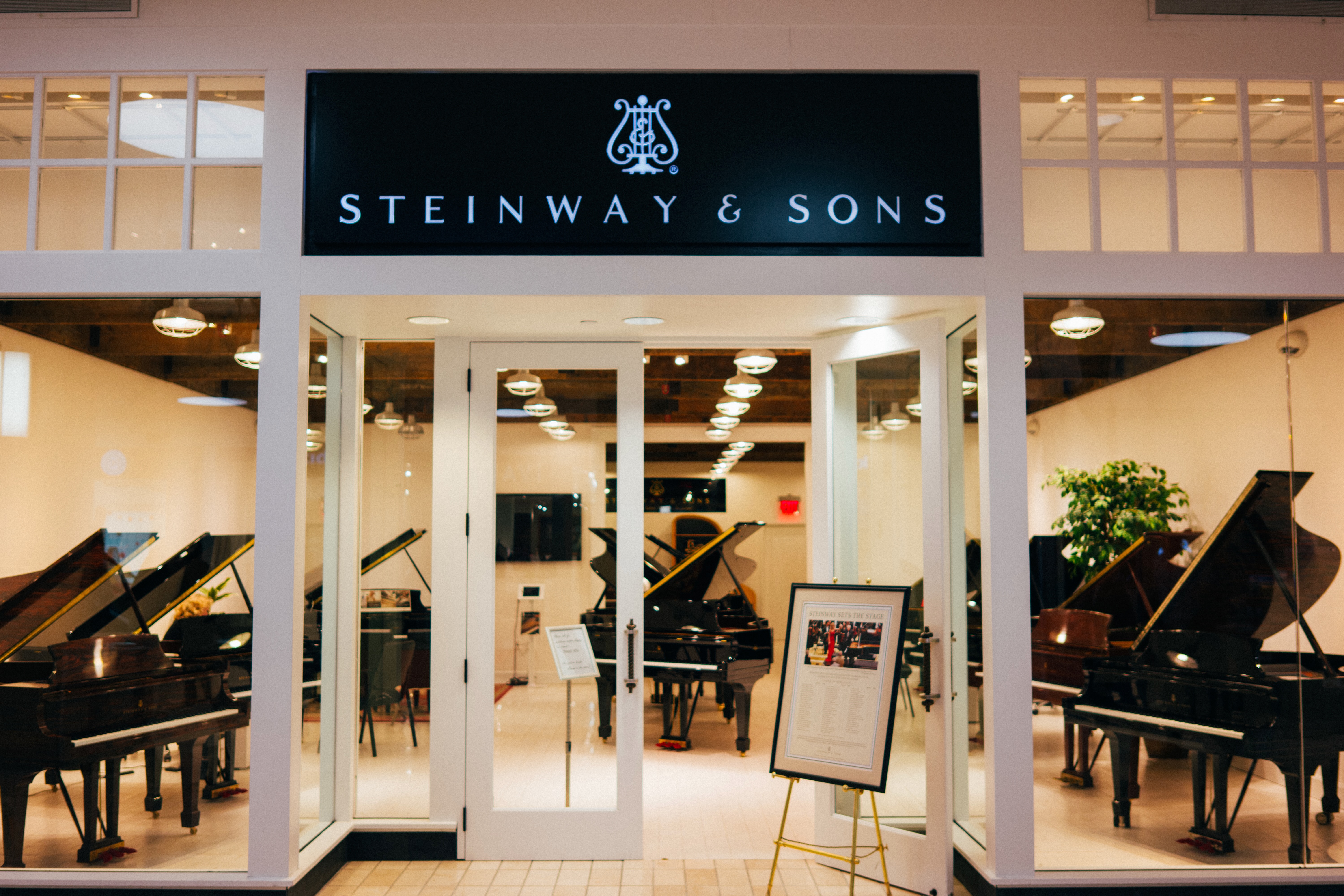 The photograph captures the inviting entrance of a Steinway & Sons showroom, where grand pianos stand elegantly arranged within bright, airy interiors. The warm lighting enhances the polished surfaces of the instruments, creating an atmosphere of sophistication and musical inspiration. The clear glass doors and stylish signage draw the viewer in, inviting an exploration of the artistry within.