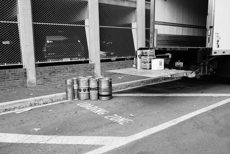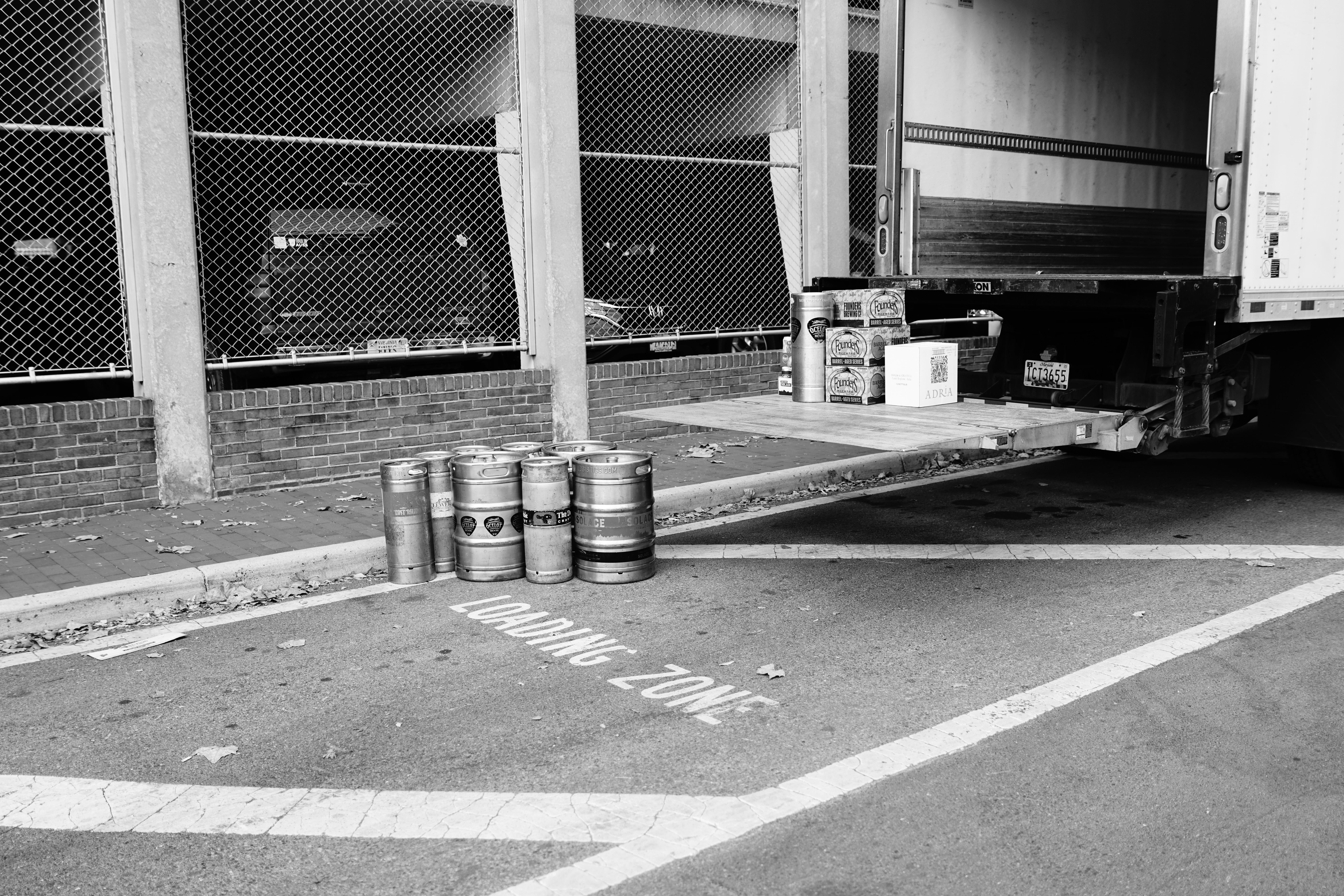 This monochrome photograph captures a loading zone scene, where a truck is parked with a lowered ramp. Metal kegs and boxes sit in stark contrast to the surrounding concrete and chain-link fencing, evoking a sense of industrial quietude. The soft lighting emphasizes the textures and shapes, enhancing the mood of temporary pause in an otherwise bustling urban environment.