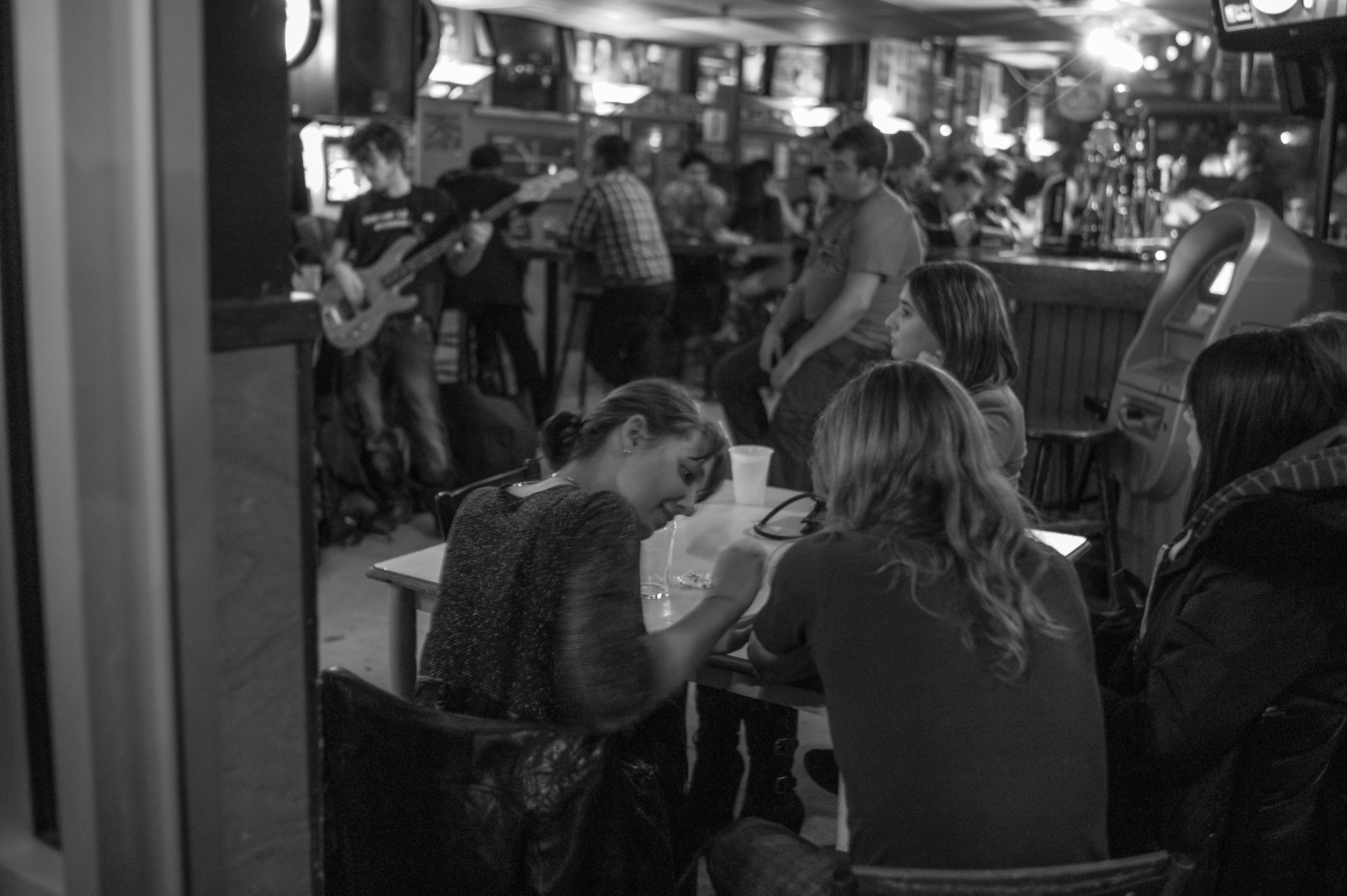 In a bustling bar, a group of friends huddles close at a table, engrossed in conversation as live music floats in from the background. The ambient glow casts soft shadows, highlighting their relaxed expressions amidst the vibrant nightlife. The contrast of black and white captures the intimate warmth of camaraderie against the lively chaos of the scene.