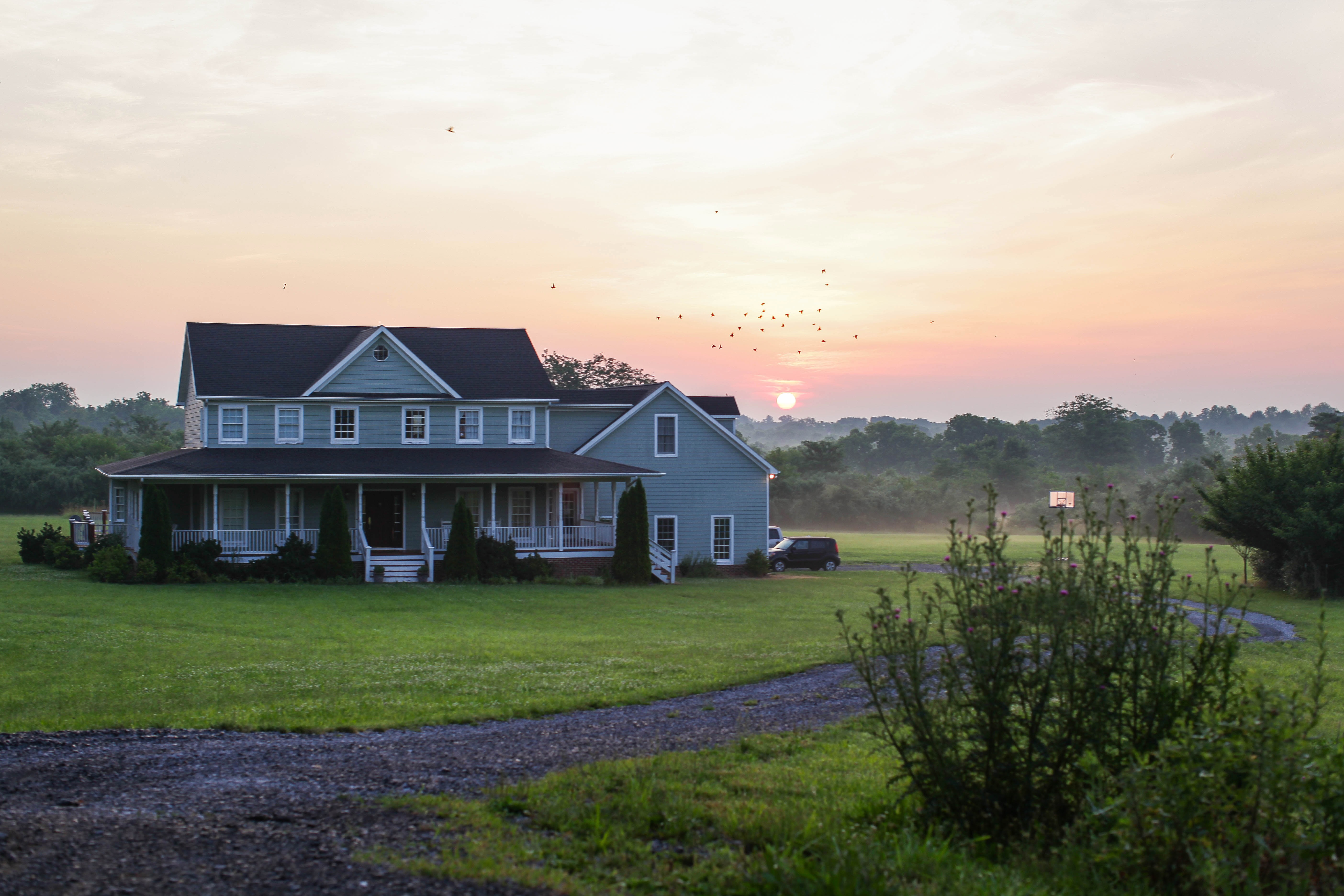 A charming blue house stands in tranquil isolation, bathed in the soft glow of dawn. The warm hues of the rising sun blend with the misty landscape, creating a serene atmosphere that invites introspection. The gravel path meanders through the dewy grass, leading the viewer's eye toward the peaceful rural setting.