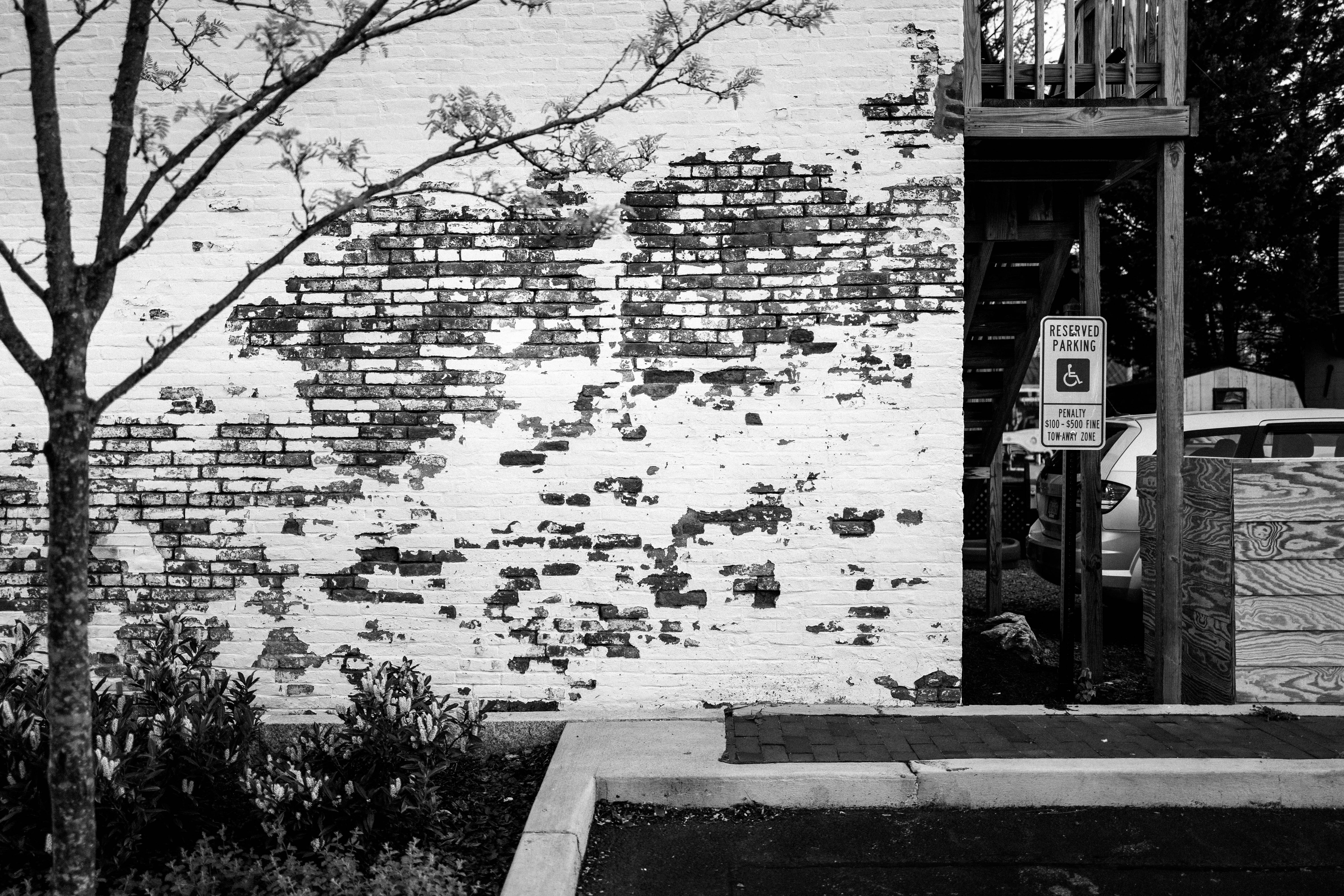 This photograph captures a textured, peeling brick wall adorned with the remnants of a heart shape, set against a stark black-and-white palette. The mood is contemplative, enhanced by the soft shadows cast by a nearby tree, while the composition cleverly juxtaposes natural and urban elements. The subtle interplay of light and shadow draws the eye, inviting viewers to ponder the passage of time within this urban landscape.