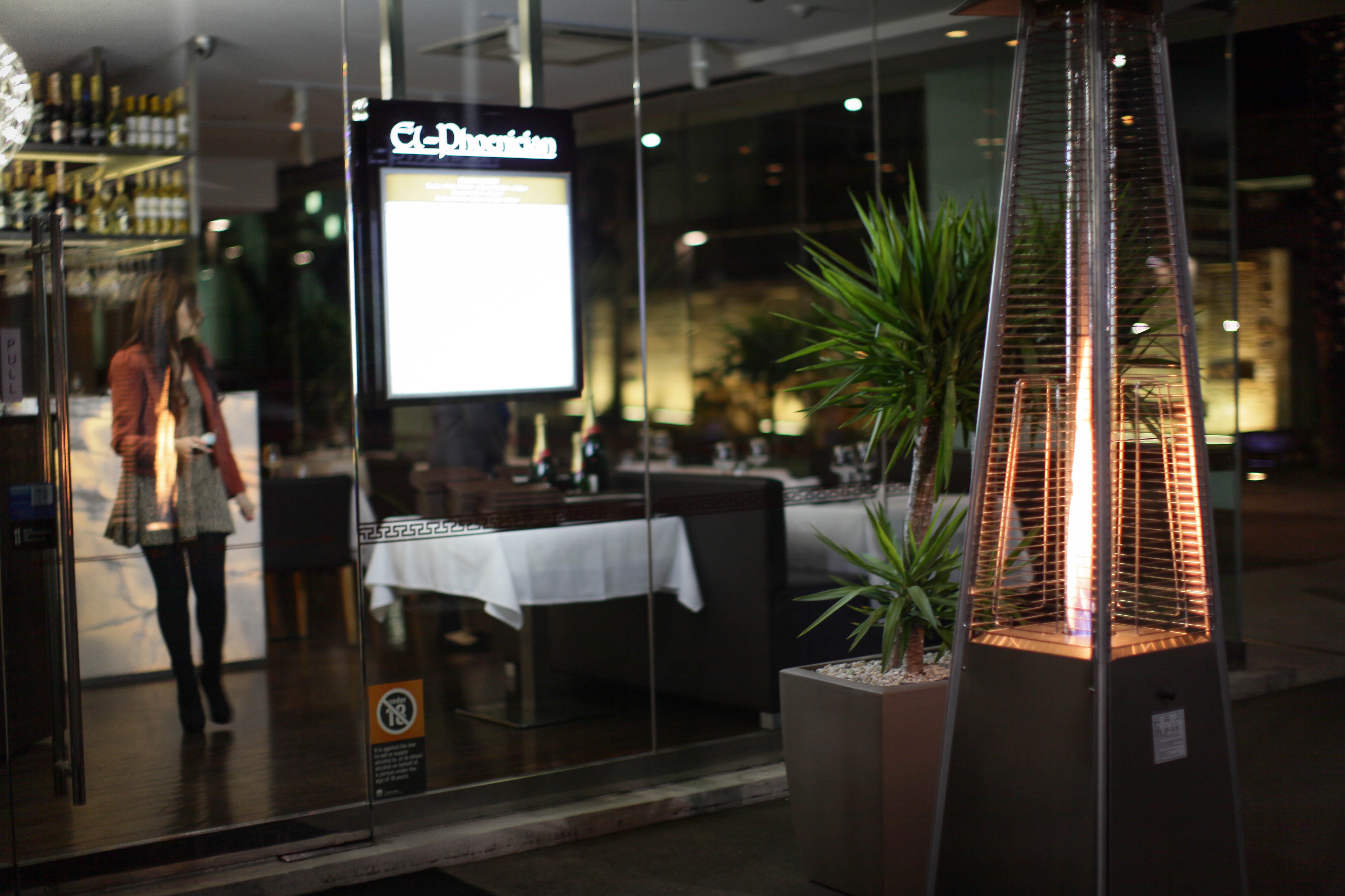 The photograph captures a chic restaurant exterior, illuminated by soft, warm lighting that invites patrons inside. A solitary figure stands outside, creating a sense of mystery and allure amidst the backdrop of elegantly set tables and a glowing heating unit. The composition juxtaposes nature and urban sophistication, setting a cozy yet upscale mood for diners.