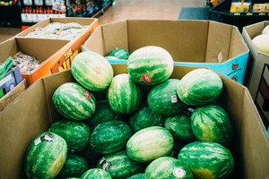 Amidst the vibrant display of fresh watermelons, the photograph captures the essence of summer in a grocery store setting. Soft, natural light pours in, highlighting the glossy green rinds and evenly distributed price stickers, creating a inviting atmosphere that beckons shoppers. The array of melons, piled high and overflowing, evokes a sense of abundance and nostalgia, reminiscent of warm days and family picnics.