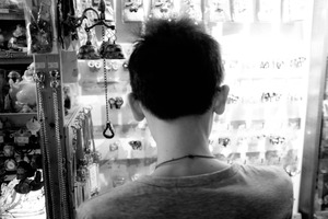 In this poignant black-and-white photograph, a young figure stands with their back to the viewer, captivated by a myriad of trinkets displayed on a wall. The lighting casts a soft glow on the items, enhancing the atmosphere of curiosity and exploration. Shadows play across the scene, evoking a sense of mystery and introspection.