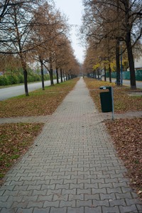 A deserted pathway stretches between bare trees, their branches almost skeletal against a gray sky. The ground is blanketed in fallen leaves, enhancing the tranquil yet somber atmosphere of late autumn. Soft, diffused light casts gentle shadows, inviting introspection along this quiet route.
