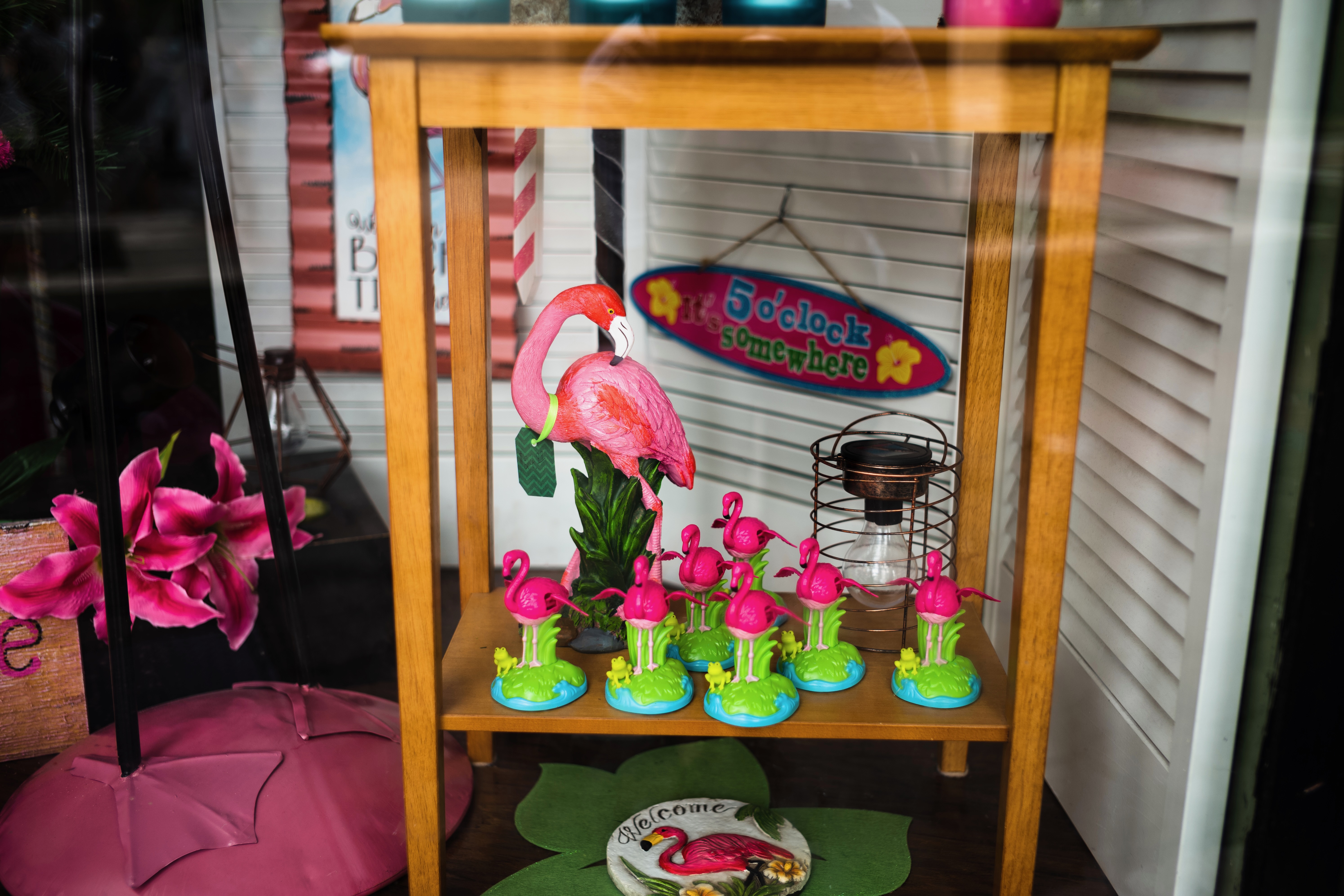 The photograph captures a vibrant display of flamingo-themed decorations arranged on a wooden shelf. The bright pink flamingos, set against a playful backdrop, evoke a cheerful and whimsical mood, enhanced by the soft lighting filtering through the glass. This lively composition invites a sense of fun and warmth, reminiscent of a tropical paradise.