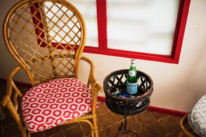 A charming corner showcases a wicker chair adorned with a bright red and white cushion, inviting relaxation. Nearby, a round table bears a sparkling water bottle, suggesting a refreshing pause in the moment. Soft lighting filters through the window, casting a warm ambiance that enhances the tranquil mood of this cozy space.
