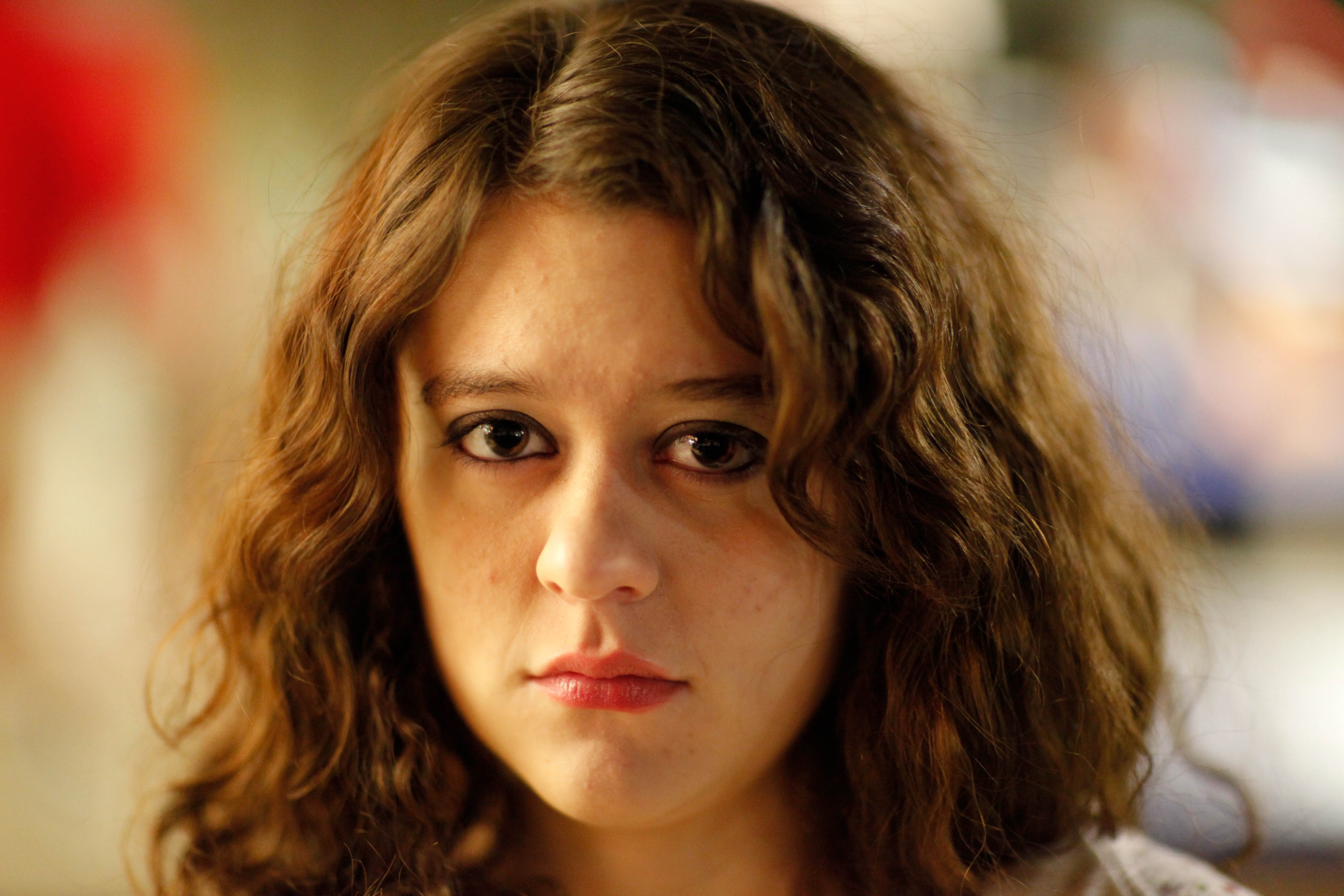 The photograph captures a young woman with curly hair, her expression solemn and contemplative, drawing the viewer into her introspective mood. Soft, diffused lighting accentuates the contours of her face, while a blurred background suggests a bustling environment, contrasting her stillness. The strong focus on her eyes creates a poignant connection, evoking a sense of vulnerability and depth.