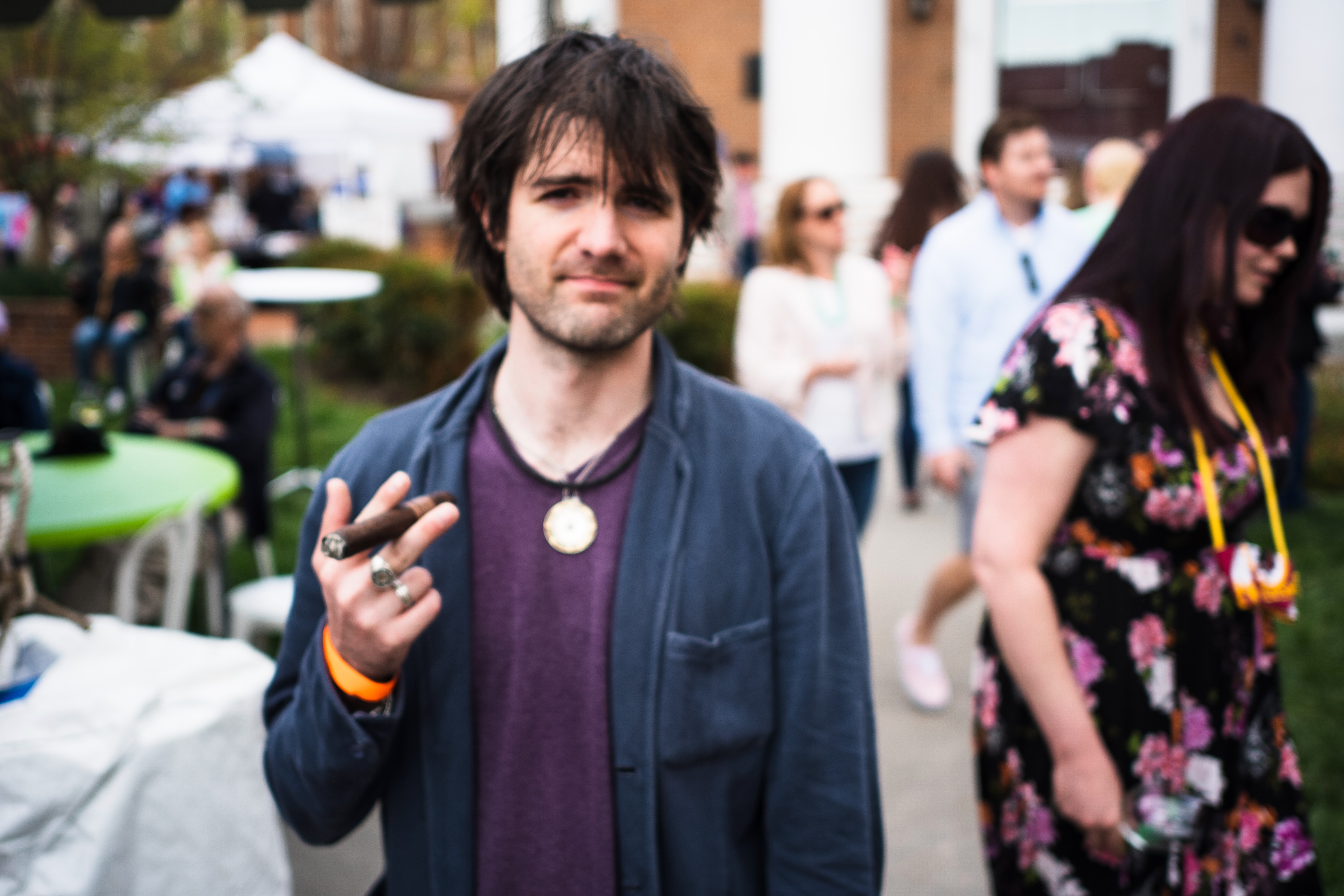 The photograph captures a young man in the foreground, casually holding two cigars and exuding an air of relaxed confidence. The blurred crowd in the background suggests a lively atmosphere, enhanced by soft natural lighting that complements the laid-back mood. His casual attire and the subtle details around him invite a sense of community and ease, making the scene feel convivial and inviting.