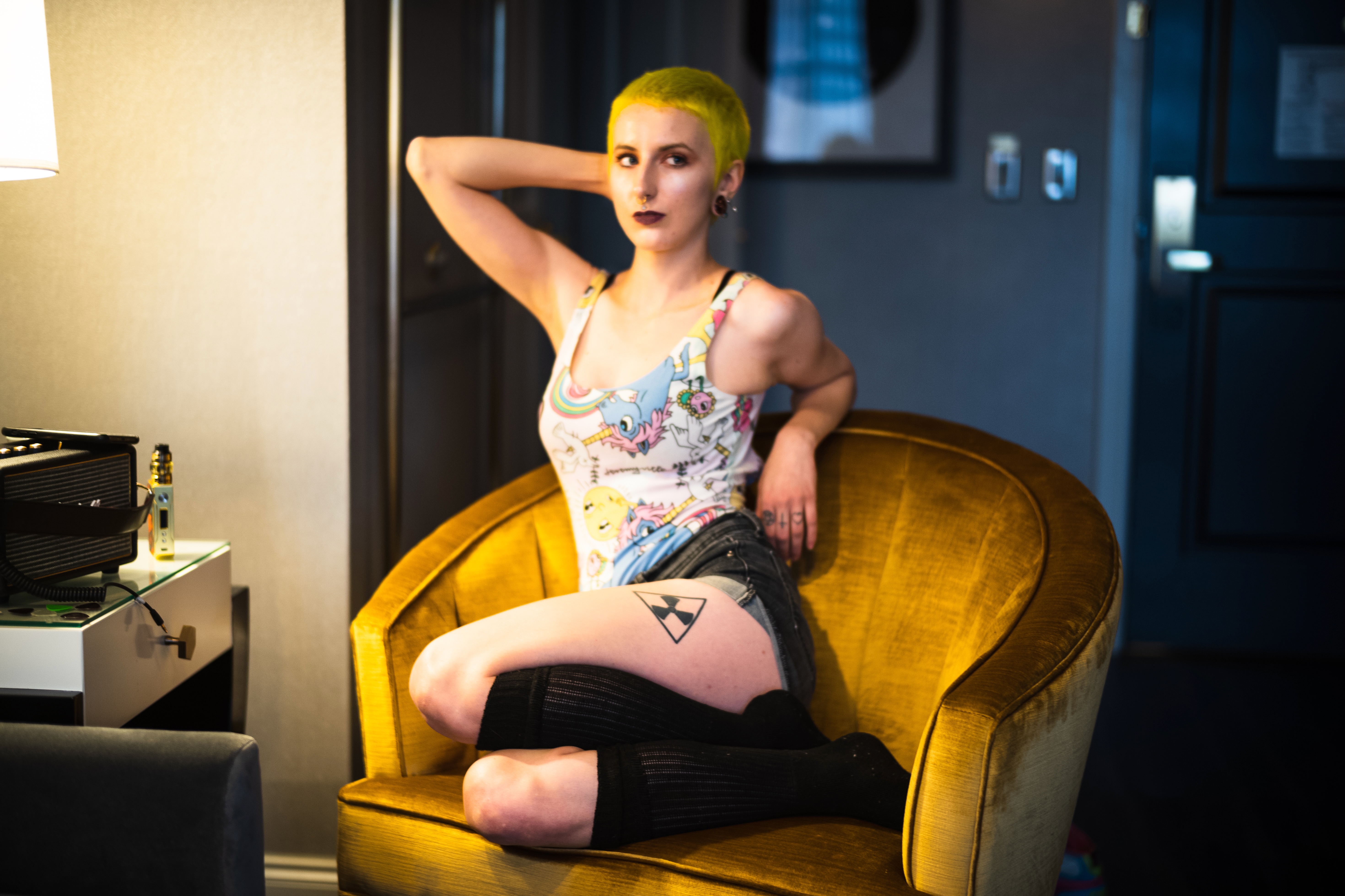 The photograph captures a young woman with vibrant yellow hair lounging confidently in a plush, golden armchair. The ambient lighting casts a warm glow, enhancing the playful mood of her colorful attire and striking tattoos, while the contemporary setting adds a touch of urban chic. Her relaxed pose and direct gaze create an intimacy that invites the viewer into her world.