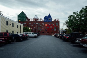 This photograph captures a unique brick wall adorned with colorful, artistic patches, rising above a parking lot filled with vehicles. The mood is contemplative, enhanced by the overcast sky that casts a soft, diffused light on the scene. The composition draws the viewer's eye down the empty road towards the striking mural, creating a sense of depth and intrigue.
