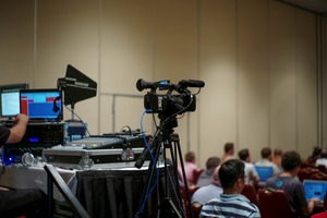 In this candid shot, a video camera captures the energy of a conference room filled with focused attendees. The mood is industrious, illuminated by soft lighting that highlights the technical equipment, contrasting with the blurred figures of participants engaged in learning. The composition draws the viewer's eye from the control station to the crowd, emphasizing the interplay between the unseen presenters and their audience.