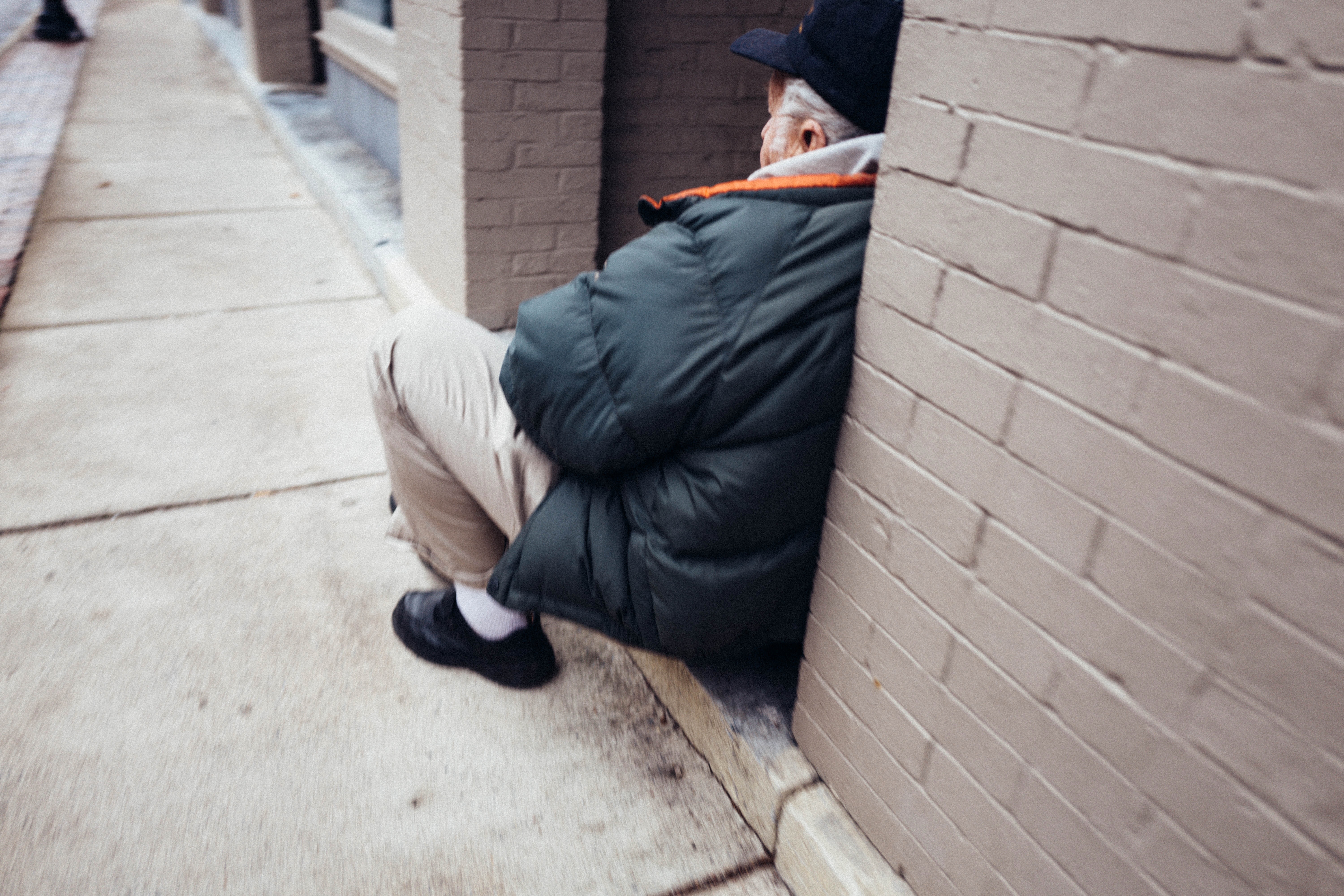 A solitary figure is nestled against a wall, conveying a sense of introspection and isolation. The muted tones and soft lighting create a somber mood, highlighting the subject's vulnerability. The composition, with the angle emphasizing the space around the person, evokes a feeling of quiet contemplation amidst the bustle of the city.