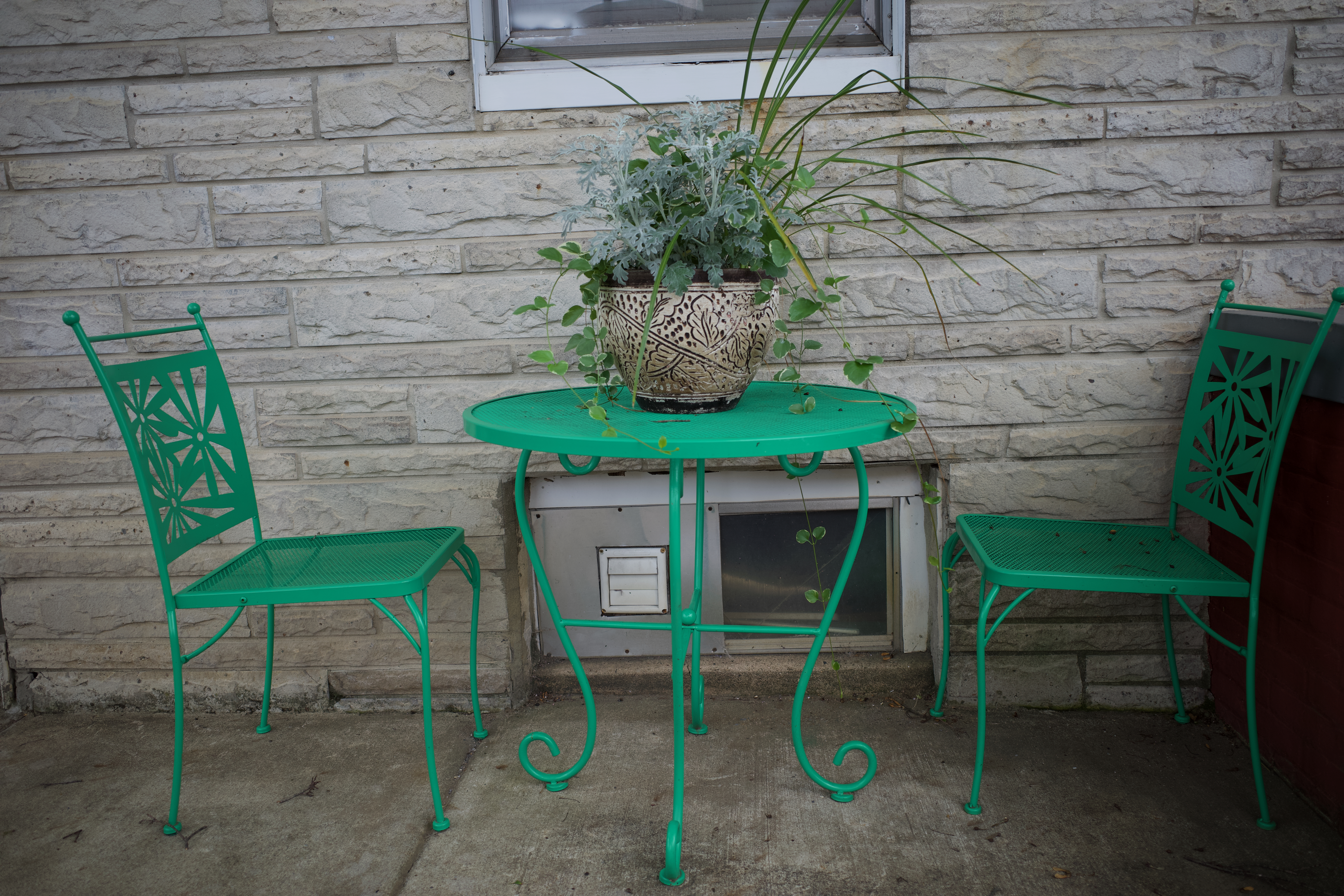 A charming outdoor setting features a vibrant green table with two matching chairs, inviting a moment of tranquility. The potted plant at the center bursts with life, contrasting against the muted stone wall behind it. Soft, diffused light enhances the cozy atmosphere, evoking a sense of peace and simple beauty.