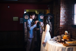 In a warmly lit room, a couple shares a playful moment as they feed each other cake, embodying joy and intimacy. The soft glow highlights their expressions against a backdrop of rustic brick and softly colored decor, creating a romantic atmosphere. The table adorned with an assortment of treats adds to the festive yet intimate feeling of the scene.