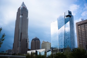 The photograph captures a striking urban skyline dominated by a mix of modern and classic architecture, with the tall, intricately-designed building juxtaposed against sleek glass façades. The mood is a blend of calm and anticipation, as the overcast skies loom overhead, casting a soft, diffused light on the structures. Lush greenery in the foreground adds a hint of nature, enriching the composition and providing balance to the architectural forms.