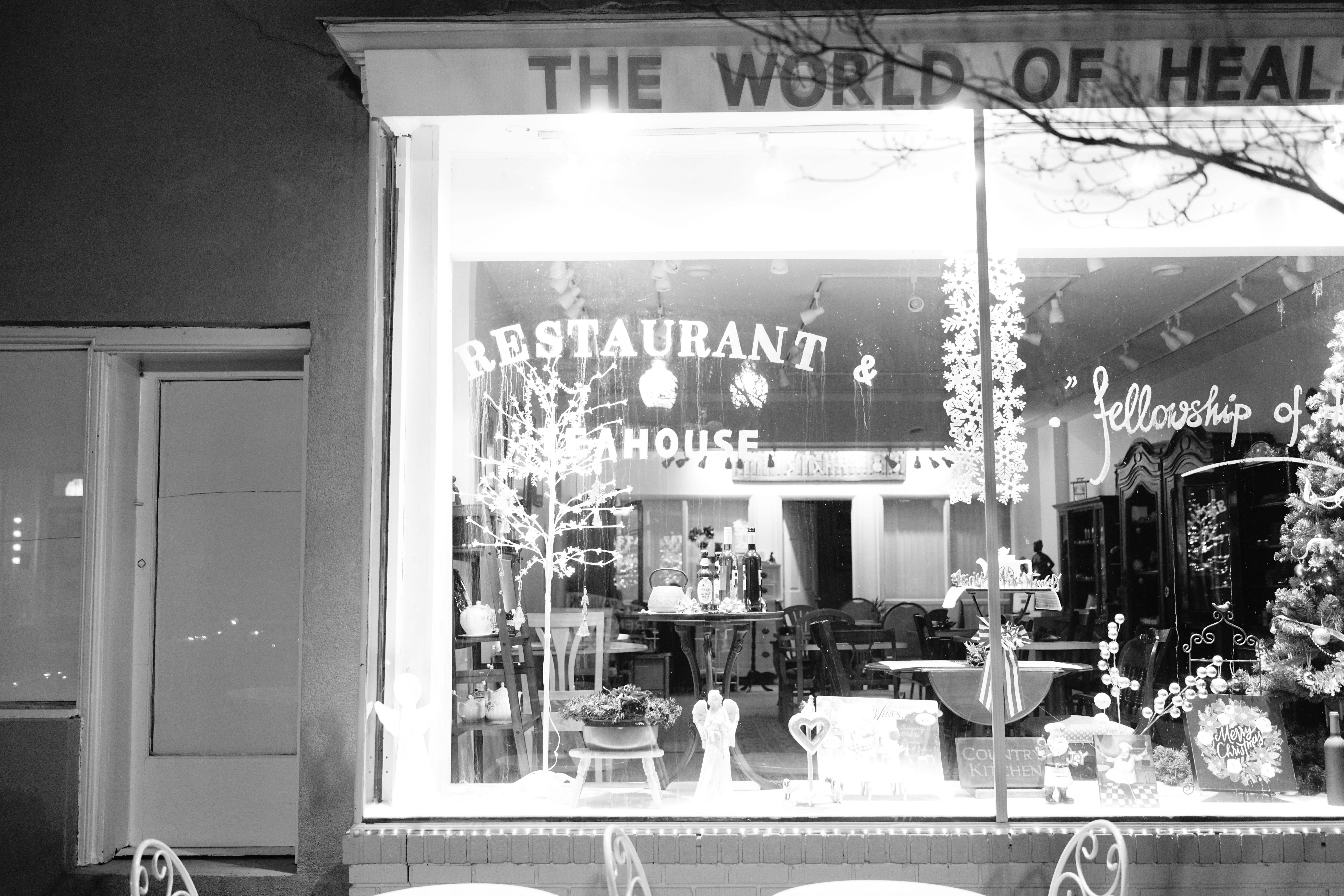 The photograph captures a warmly-lit restaurant window, adorned with festive decorations and inviting seating. The black-and-white tones evoke a sense of nostalgia and tranquility, while the soft glow from inside contrasts with the evening darkness outside. Intricate details suggest a haven for comfort and community, inviting viewers to imagine the stories unfolding within.
