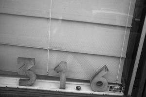 The photograph captures a close-up of weathered numbers '316' resting on a window sill, contrasting starkly with the soft white of the background blinds. The muted black-and-white tones evoke a sense of nostalgia and stillness, while the uneven placement of the digits adds a touch of casual charm. A small security warning sign peeks from the corner, hinting at the life and stories behind the quiet facade.