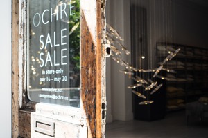 This photograph captures the inviting entrance of a boutique, framed by a rustic wooden door showcasing a tasteful sale advertisement. The soft, natural sunlight filters through, illuminating delicate hanging lights inside, creating a warm and welcoming atmosphere that draws the viewer's eye inward. The composition contrasts the textured door with the sleek interior, encapsulating a blend of old-world charm and modern design elegance.