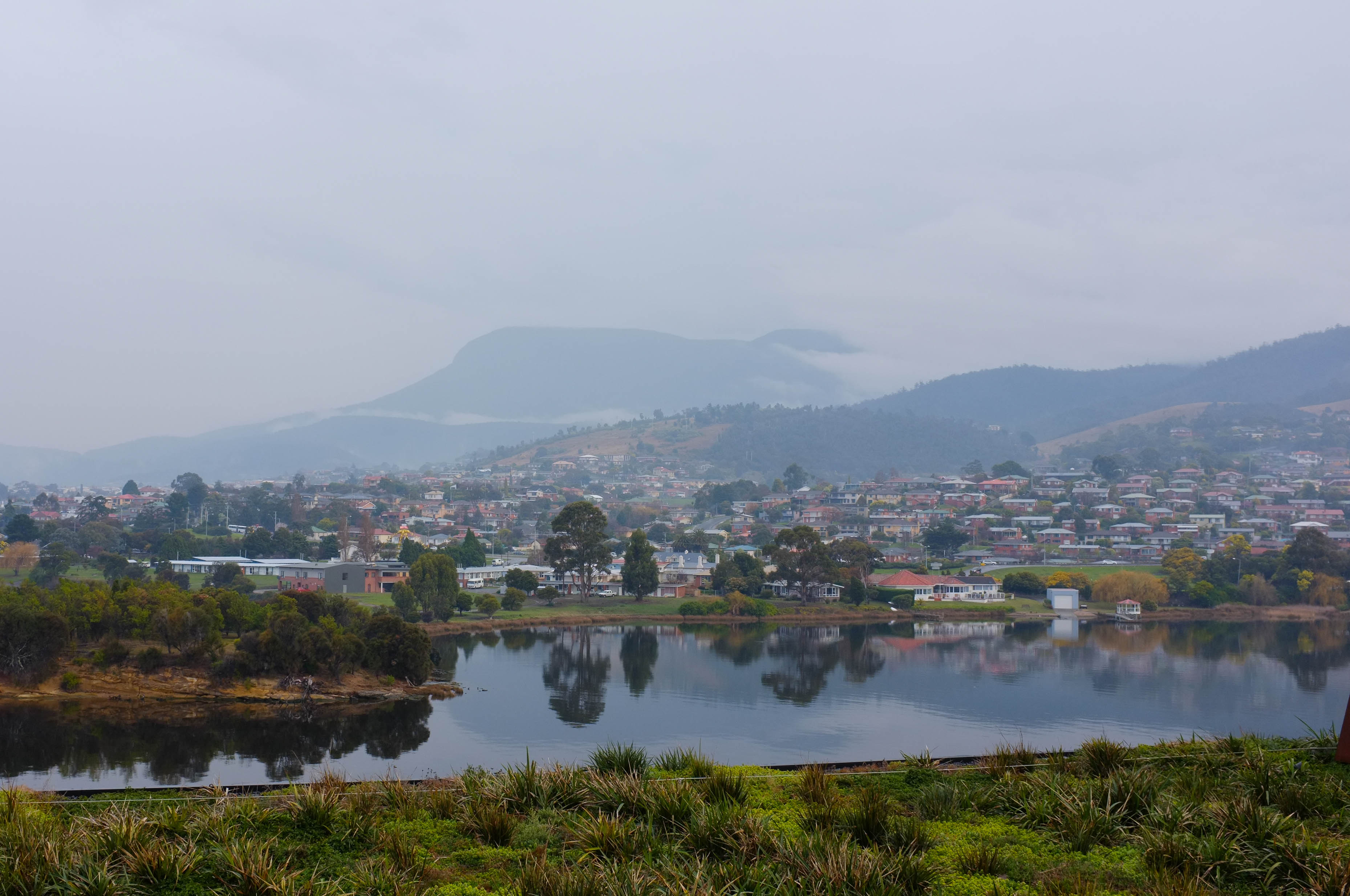 This tranquil photograph captures a picturesque town nestled by a calm body of water, under a blanket of soft, gray clouds. The muted lighting and hazy atmosphere create a serene and contemplative mood, while the reflections on the water mirror the surrounding landscape, enhancing the sense of peaceful isolation. Framed by gentle hills, the scene invites the viewer to pause and appreciate the quiet beauty of nature and human habitation intertwined.