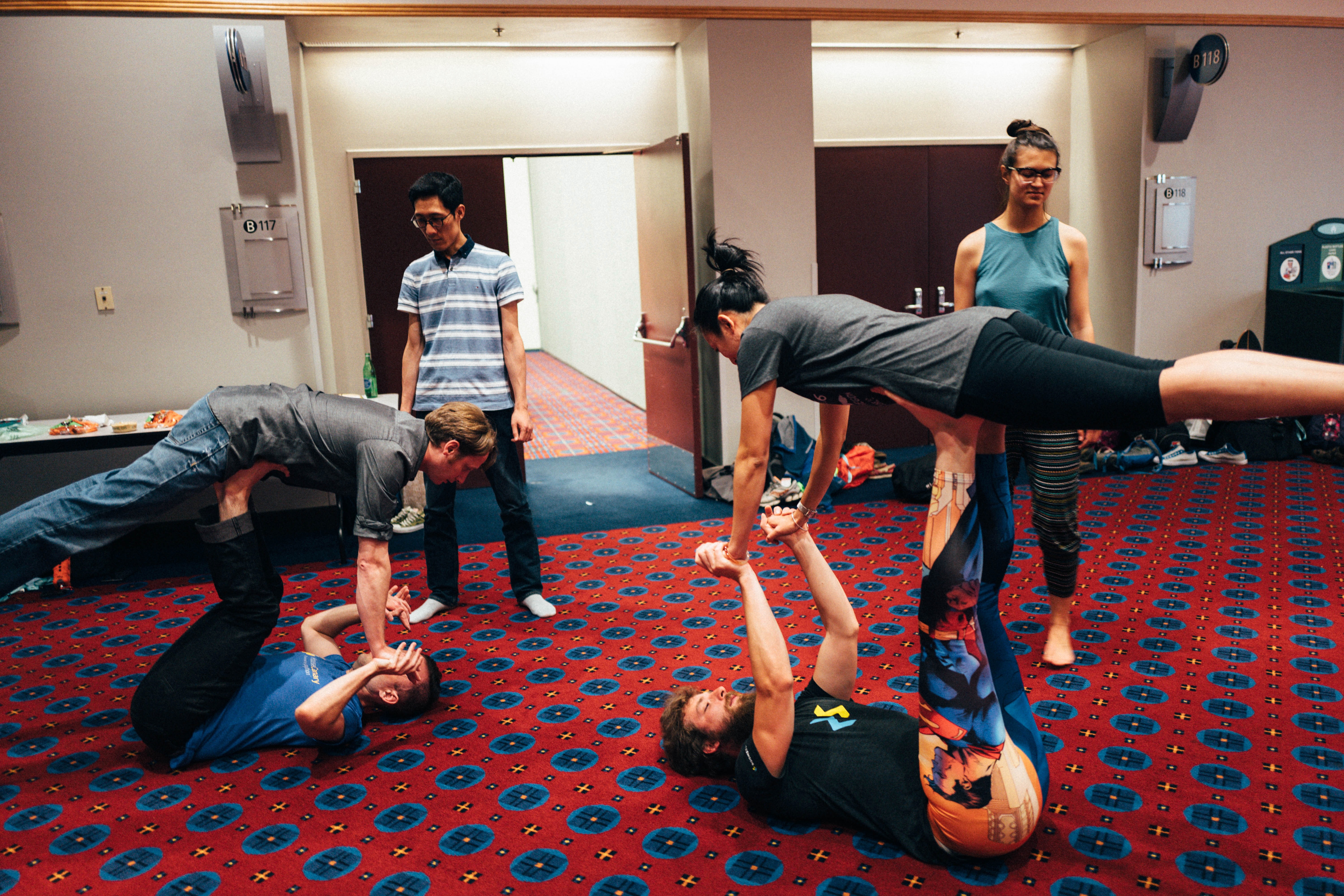 In a vibrant indoor setting, a group of friends engages in a dynamic acrobatic performance, showcasing their balance and trust in each other. The playful mood is enhanced by bright colored clothing and the supportive camaraderie among the participants. Soft, natural lighting fills the space, highlighting their focused expressions and the intricate formations they create together.