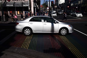 A silver car stands prominently on a vibrant, rainbow-crosswalk, casting striking shadows in the afternoon sunlight. The scene is lively, with pedestrians bustling around, embodying the energy of urban life. The colorful lines of the crosswalk contrast beautifully with the muted tones of the surrounding buildings, creating a dynamic composition.