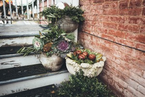 This photograph captures a serene arrangement of lush greenery and decorative pots on a weathered staircase, framed against a rustic brick wall. The soft, natural lighting enhances the earthy tones, invoking a cozy, inviting mood perfect for fall. The intricate details of the plants create a harmonious blend of nature and artistry, inviting the viewer to linger and appreciate the tranquil beauty.