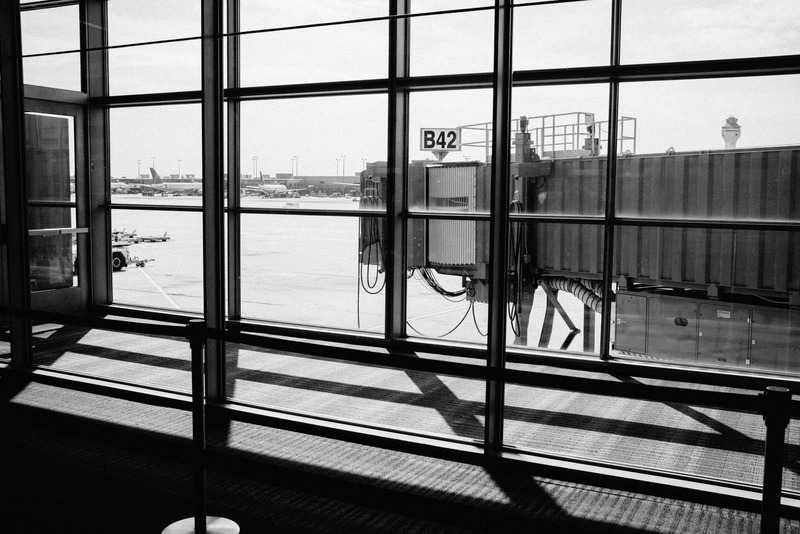 This black-and-white photograph captures the starkness of an airport terminal, featuring a view of the tarmac through large glass panels. The mood is contemplative, enhanced by geometric shadows and a sense of anticipation as the sunlight filters into the space. The composition emphasizes the emptiness of the scene, with the solitary gate B42 standing as a silent sentinel to journeys yet to begin or recently completed.