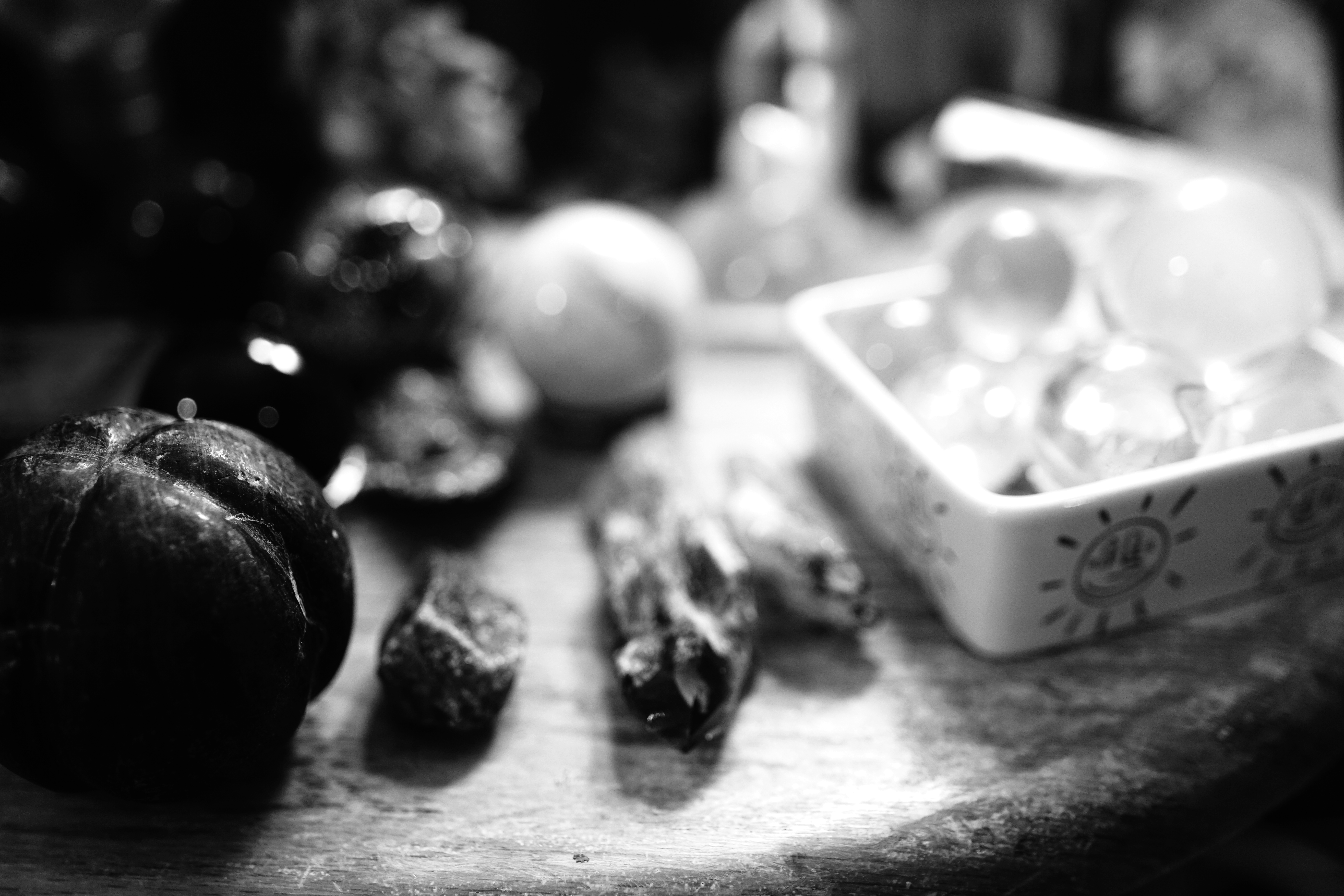 This evocative black-and-white photograph captures an array of textured objects scattered on a wooden surface, creating a sense of quiet intrigue. The soft, diffused lighting enhances the depth and detail of the items, drawing the viewer's eye along the composition from the foreground to the background. The blurred elements in the backdrop add a subtle sense of mystery, inviting contemplation.