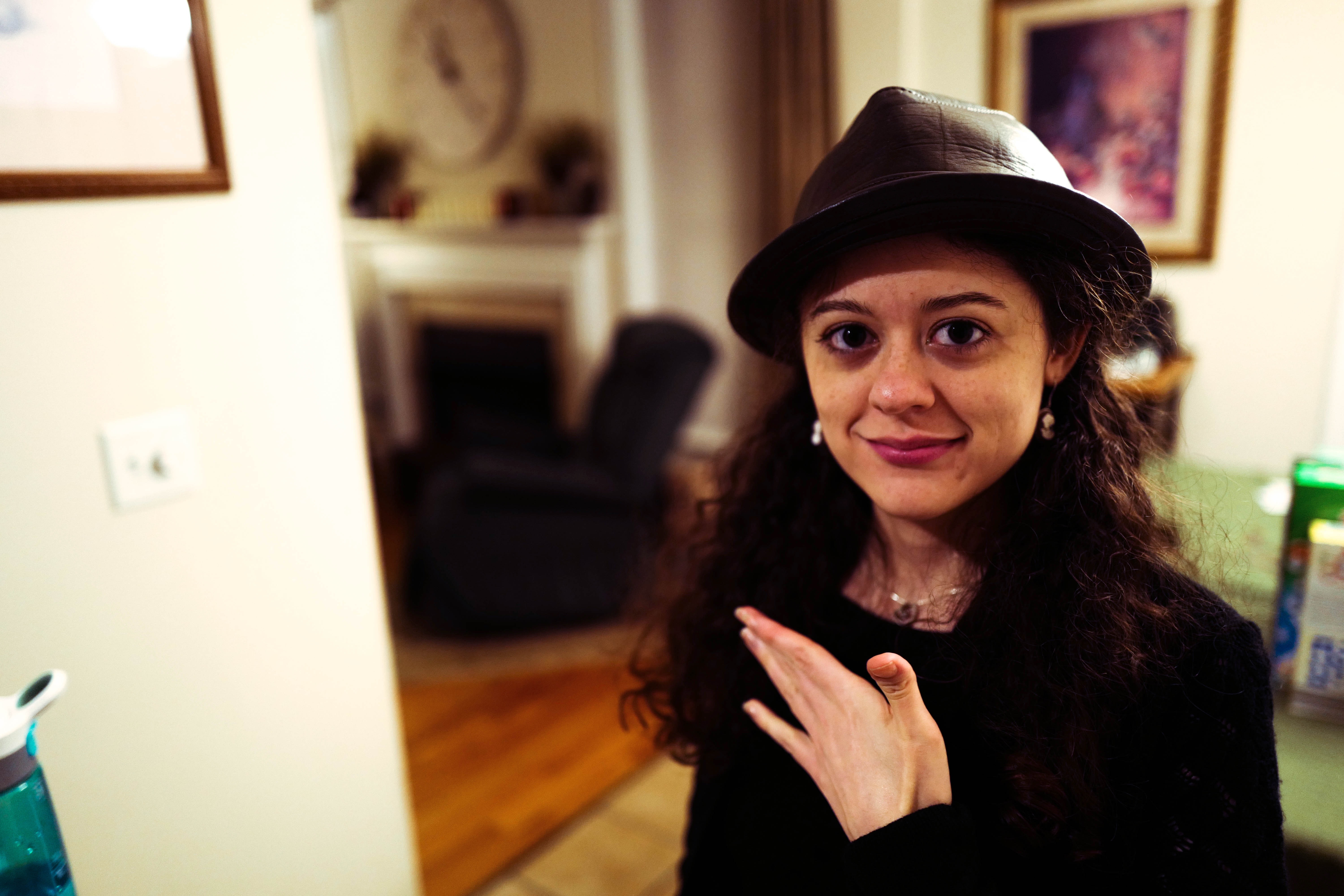 In a warmly lit room, a young woman strikes a playful pose while wearing a stylish hat, her expression inviting and cheerful. The cozy background, featuring a hint of furniture and decor, complements her relaxed demeanor, creating an intimate and welcoming atmosphere. The soft, ambient lighting accentuates her features, enhancing the overall warmth of the scene.