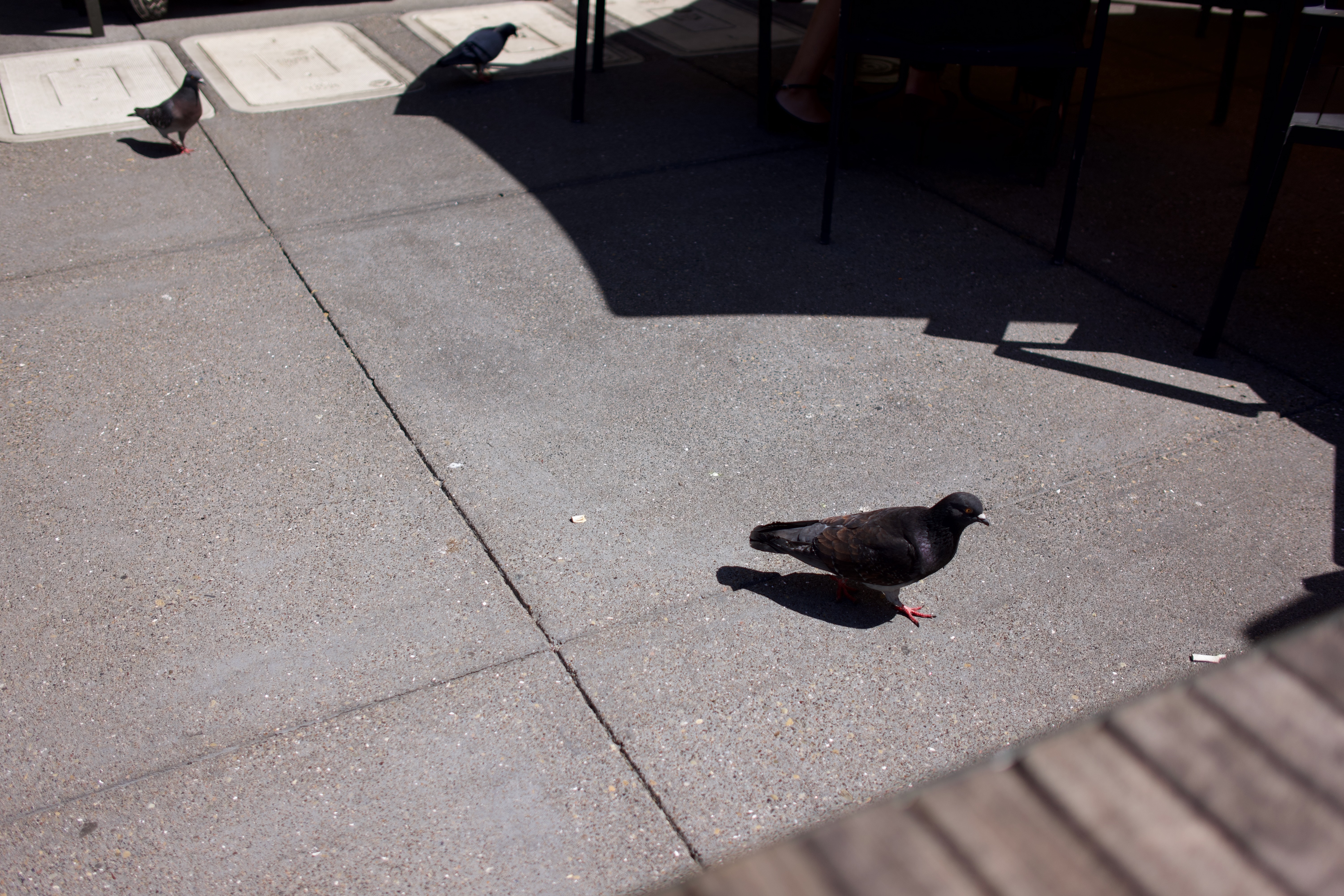 In a sunlit urban setting, a solitary pigeon strolls across a concrete patio, casting a soft shadow against the ground. The play of light creates a contrasting atmosphere, highlighting the stark simplicity of the scene. With a gentle backdrop of human presence subtly implied, the mood captures a moment of stillness amidst the bustle of city life.