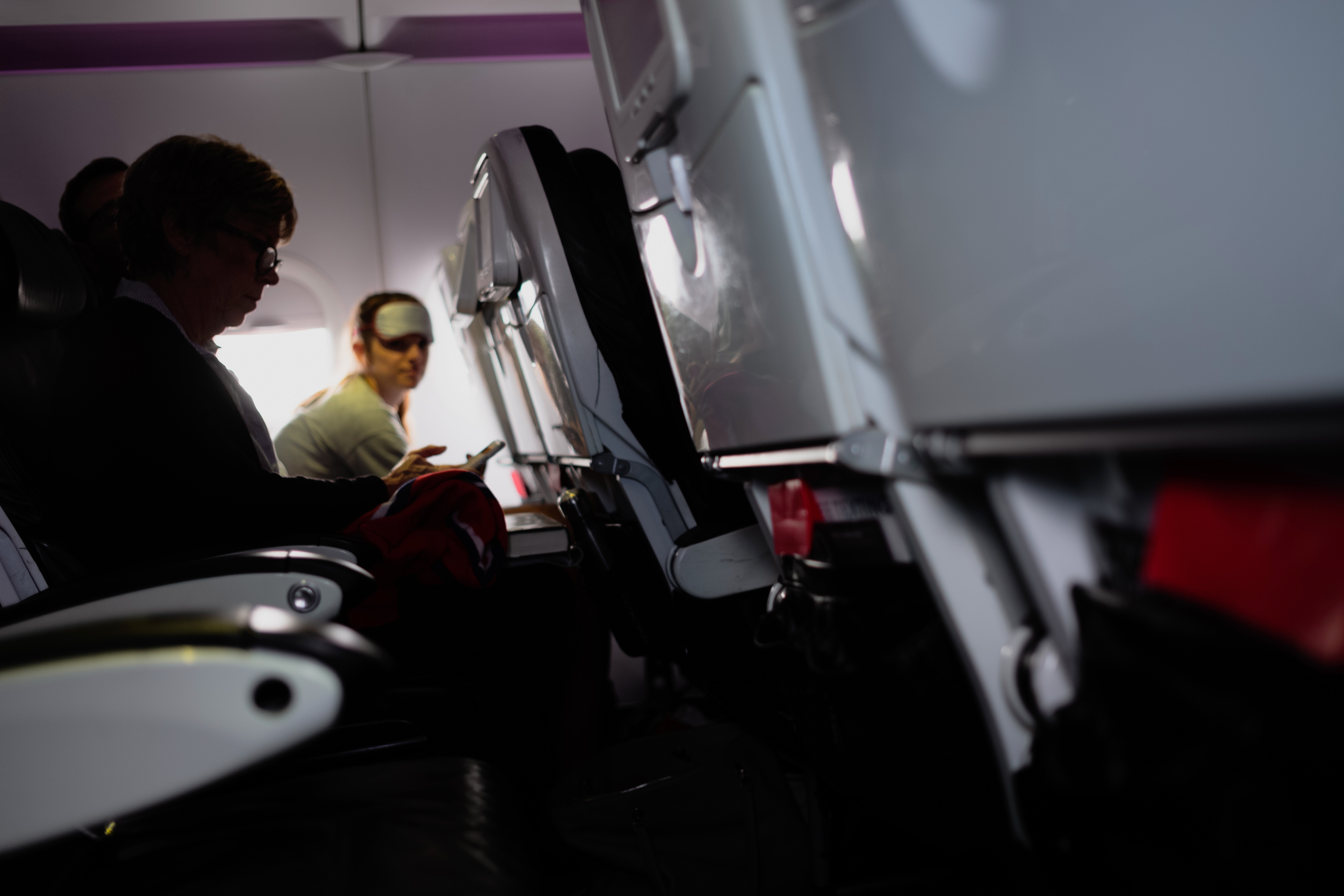 This photograph captures an intimate moment aboard an airplane, highlighting two passengers immersed in their own worlds. Soft, diffused lighting creates a calm ambiance, while the angled perspective emphasizes the closeness of the seats and the isolation within the shared space. The contrast between light and shadow evokes a sense of both serenity and introspection as the travelers journey through the skies.