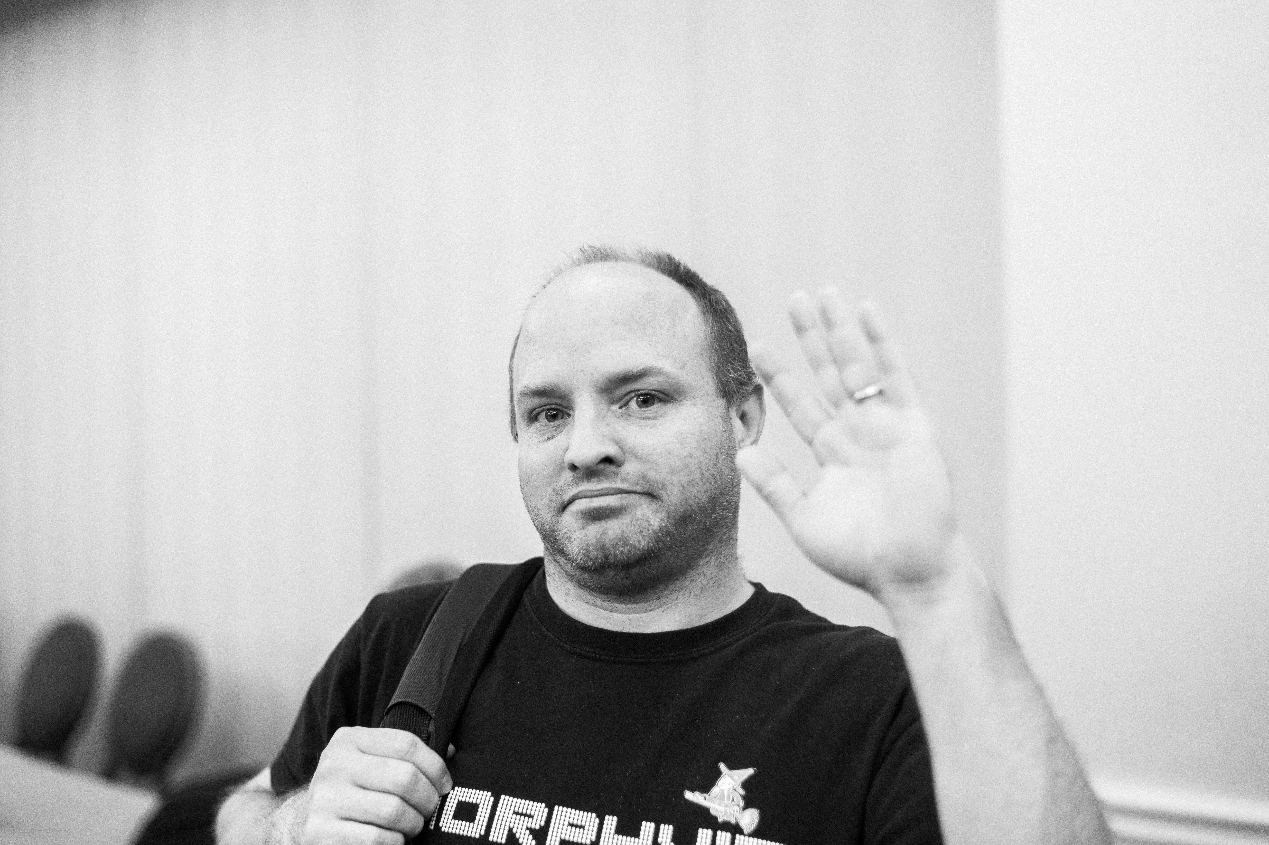 The photograph captures a man in a moment of casual farewell, raising his hand in a wave while wearing a simple black t-shirt. His expression conveys a blend of seriousness and familiarity, set against a softly blurred backdrop that hints at a social gathering. The monochrome tones enhance the mood, lending an introspective quality to the scene, inviting viewers to ponder the narrative behind the gesture.