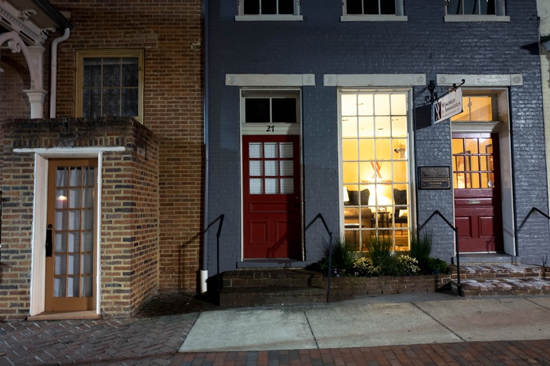 This photograph captures an inviting night scene of two adjoining buildings with distinct red doors, positioned against a cool blue-gray wall. Warm light spills from the window of the right building, creating a cozy contrast that enhances the inviting mood. The composition is balanced, with the contrasting textures of the brick and glimpses of greenery adding depth and interest to the urban landscape.
