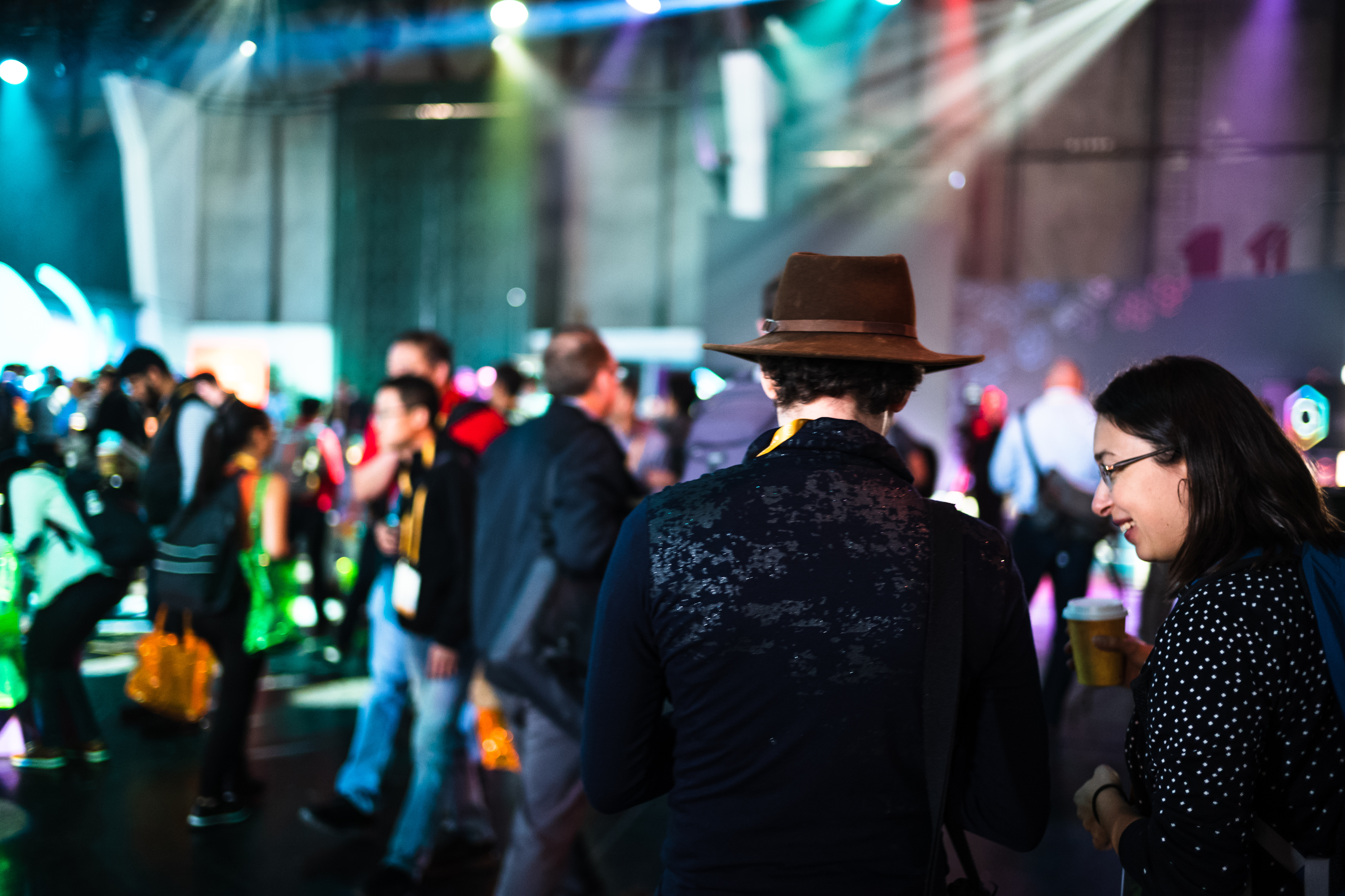 The photograph captures a lively event filled with attendees, each engaged in conversation and activity, creating a bustling atmosphere. The lighting is dynamic, with colorful beams cutting through the air, reflecting the excitement and energy of the gathering. In the foreground, two figures share a moment, embodying the spirit of connection amidst the vibrant chaos behind them.