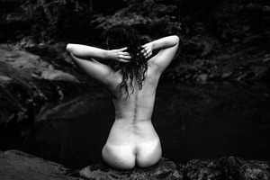 This black-and-white photograph captures a tranquil moment by a secluded water source, focusing on the back of a figure seated on a rock. The interplay of shadows and soft light accentuates the natural curves, conveying a sense of peaceful solitude and connection with nature. The lush, dark background enhances the mood of introspection, creating a harmonious blend of the subject and the surrounding environment.