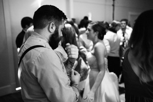In a bustling reception scene, a bearded man adjusts his suspenders, lost in thought amidst a lively crowd. The black and white composition accentuates the contrast between the intimate focus on him and the ephemeral movements of others around him, creating a mood of reflection against a backdrop of celebration. Soft lighting enhances the sense of warmth and nostalgia, inviting viewers to ponder the significance of this fleeting moment.